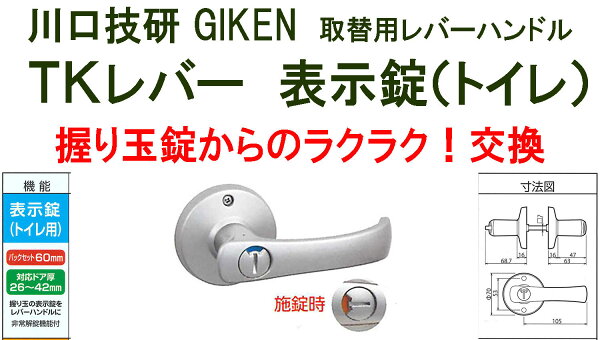 川口技研 取替TKレバー 表示錠 GIKEN DT1-4M MS シルバー色 バックセット60ミリ 取替用レバーハンドル