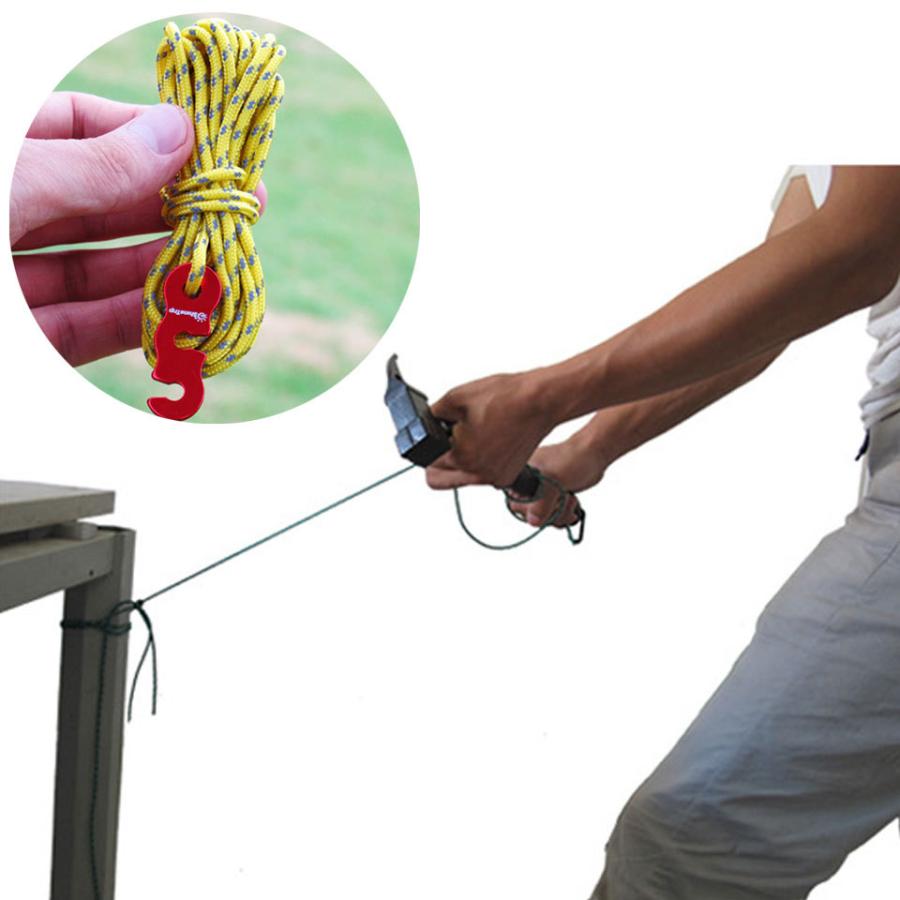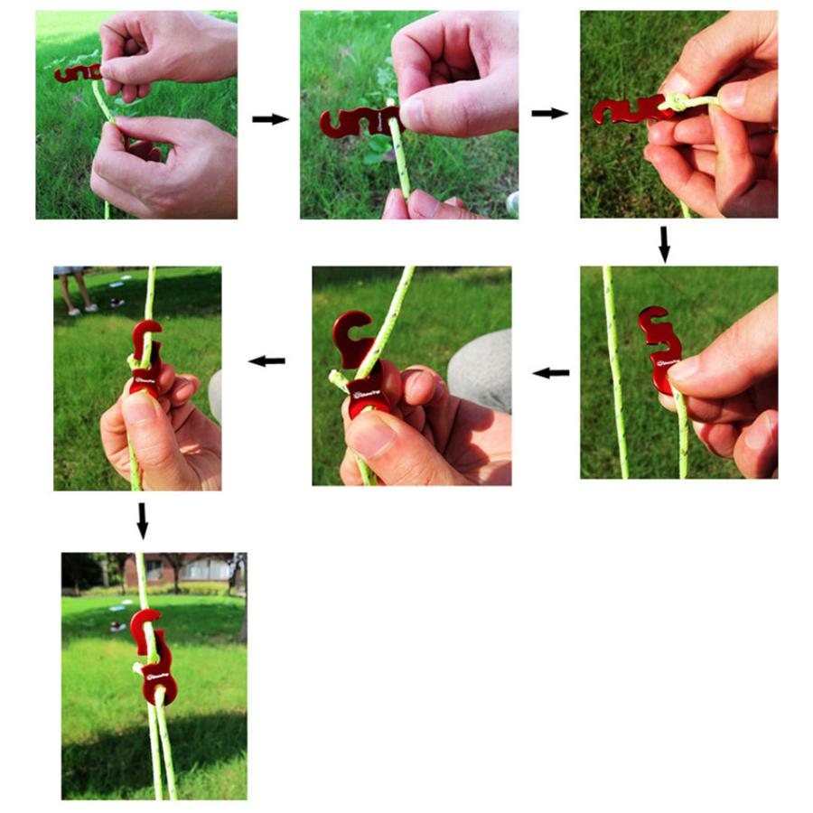専用のバックルが付いたテントロープです。引っ掛かりやすく、滑りにくいバックルなので、強い力で引っ張ってもテントロープがほどけにくいです。