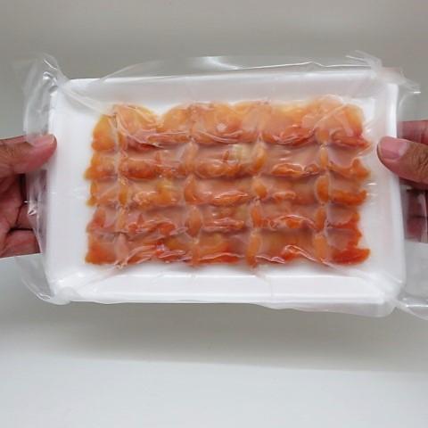 食べ方は既に開いてありますので解凍後、お刺身、すしネタ、丼物など色々な料理にお使い頂けます。流水でパックのまま解凍すると5分程度で解凍できます。