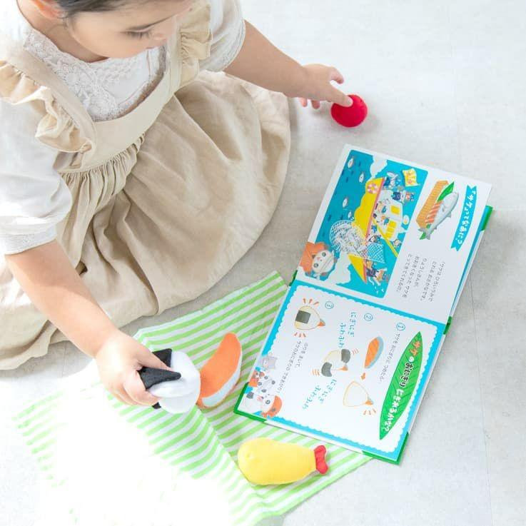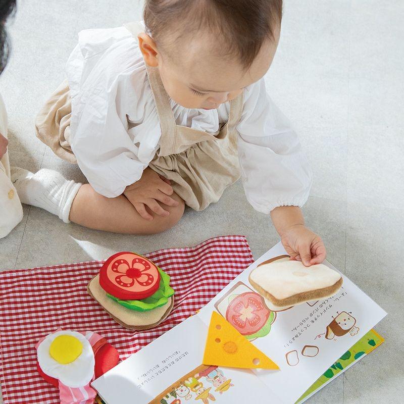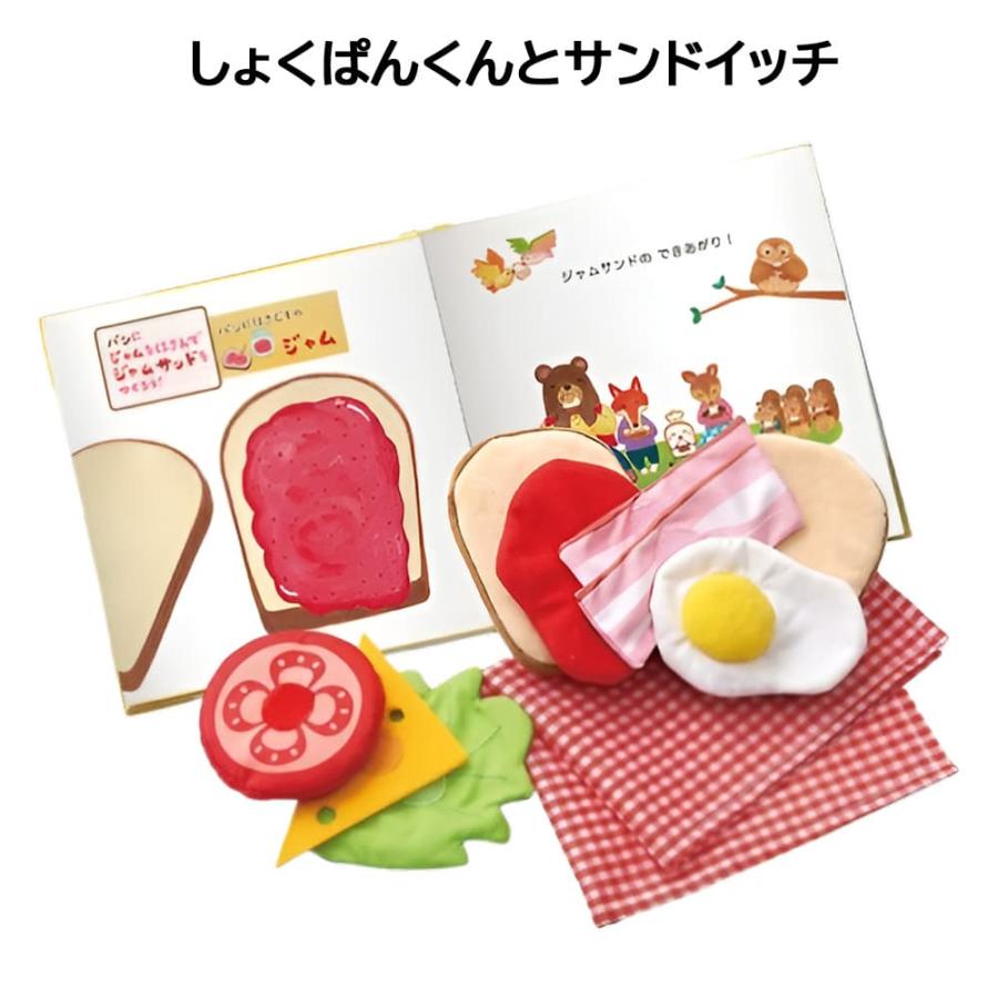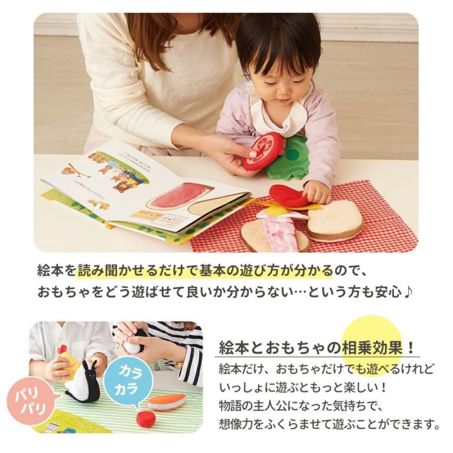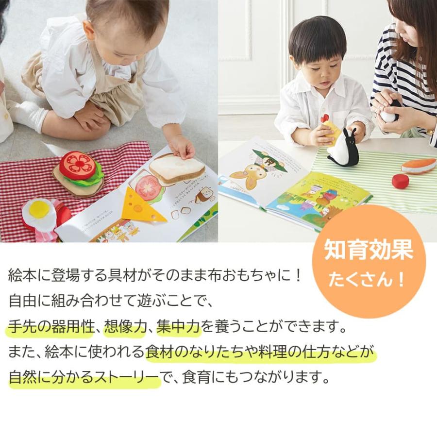 絵本と布でできたおもちゃのセットです。絵本の主人公といっしょに、いろいろな組み合 わせのサンドイッチやおにぎりを作りましょう。絵本のストーリーに沿って遊ぶことで、子どもが楽しみながら野菜や料 理に興味を持ちます。絵本以外の布おもちゃは洗濯可能です。<br />