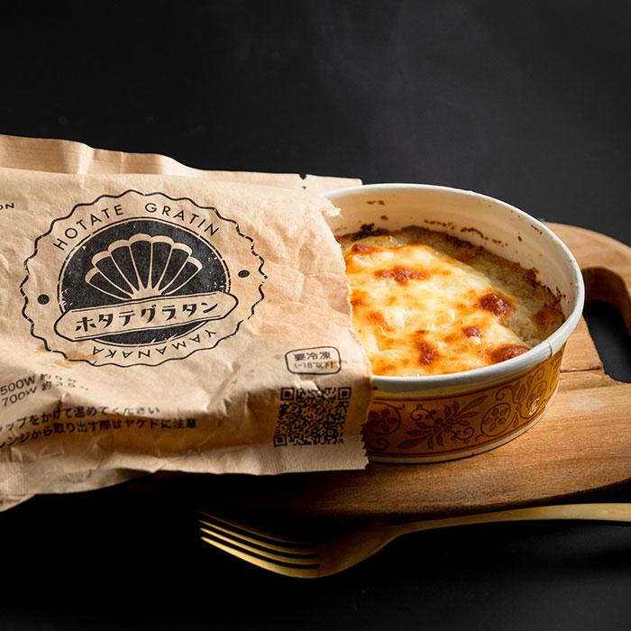 自社工場で丁寧につくられたベシャメルソースはホタテから取り出した濃厚な出汁を加えられ海を感じるソースに生まれ変わりました。ホタテの貝柱がゴロゴロと入っております。SDGSの目標のスポットを当て、原材料の帆立を余すところなく使用し、パッケージを紙にし、袋ごとレンジで加熱できます。ホワイトソースから自社工場で製造するこだわりの逸品。調味料も食塩も不使用の紙パッケージの究極のグラタン。