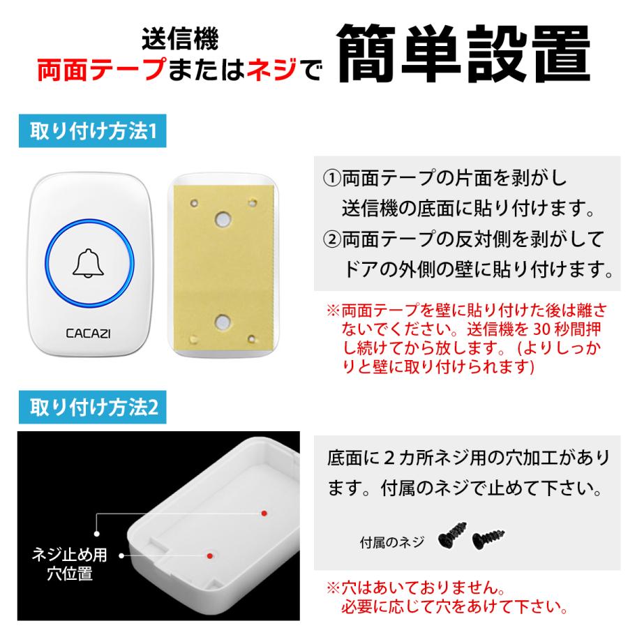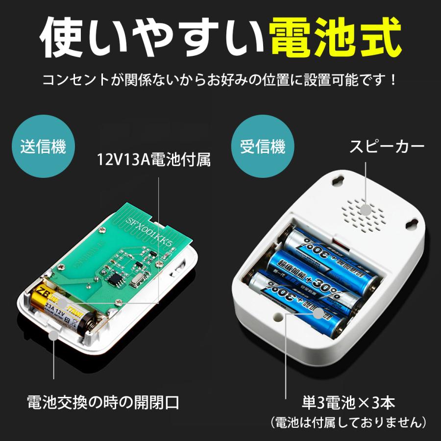 受信機は電池式で、送信機をドアフレームに固定しボタンを押すだけでチャイムが流れます!