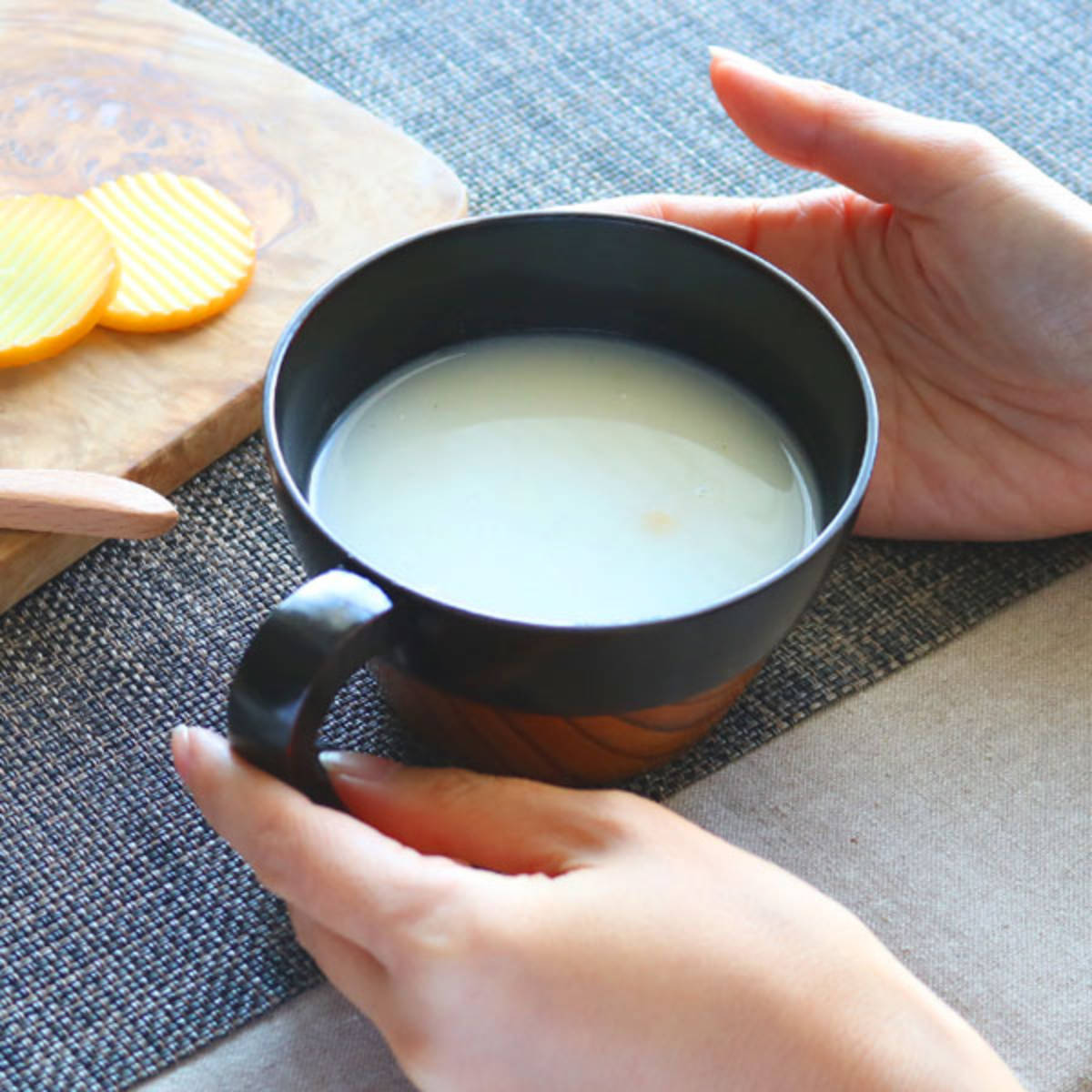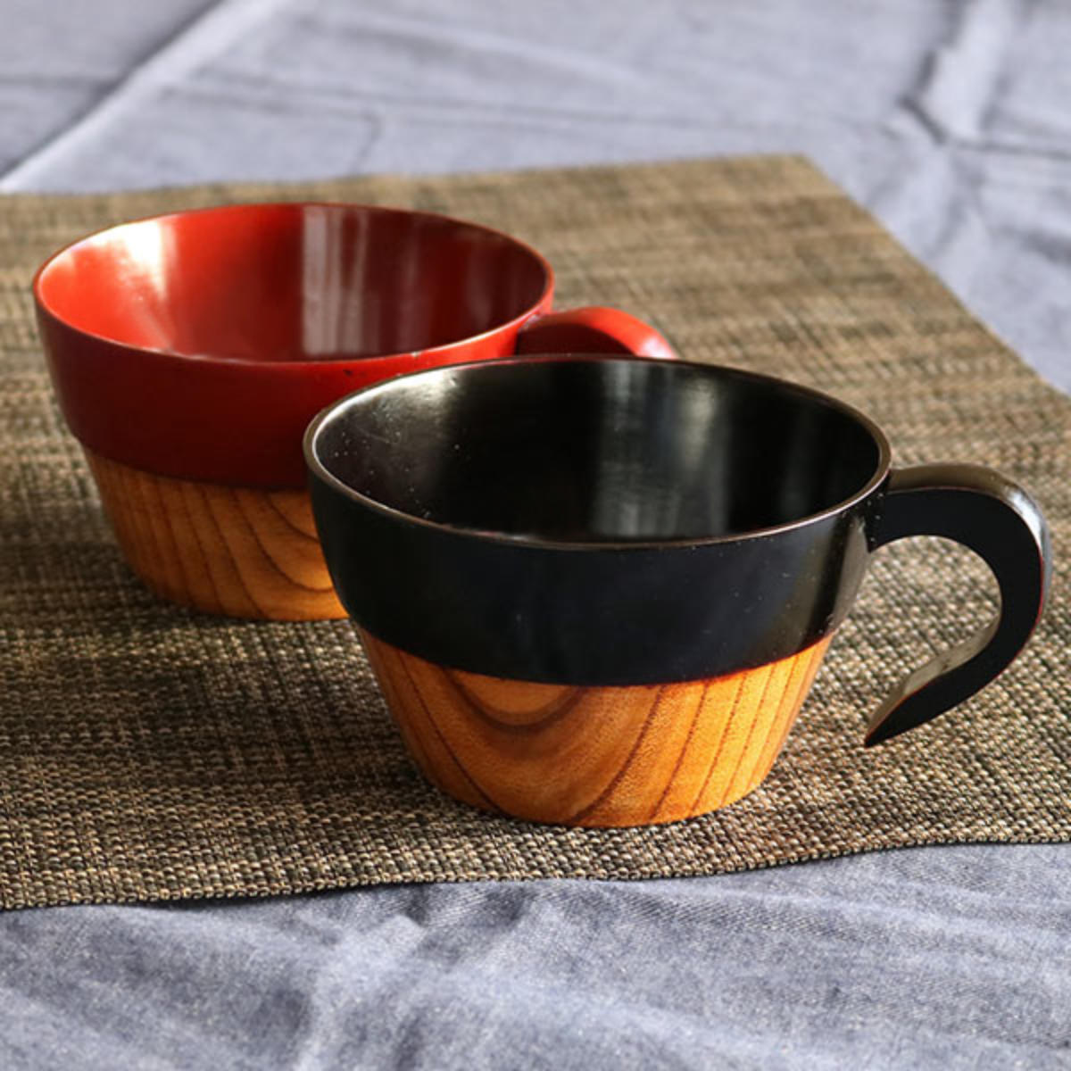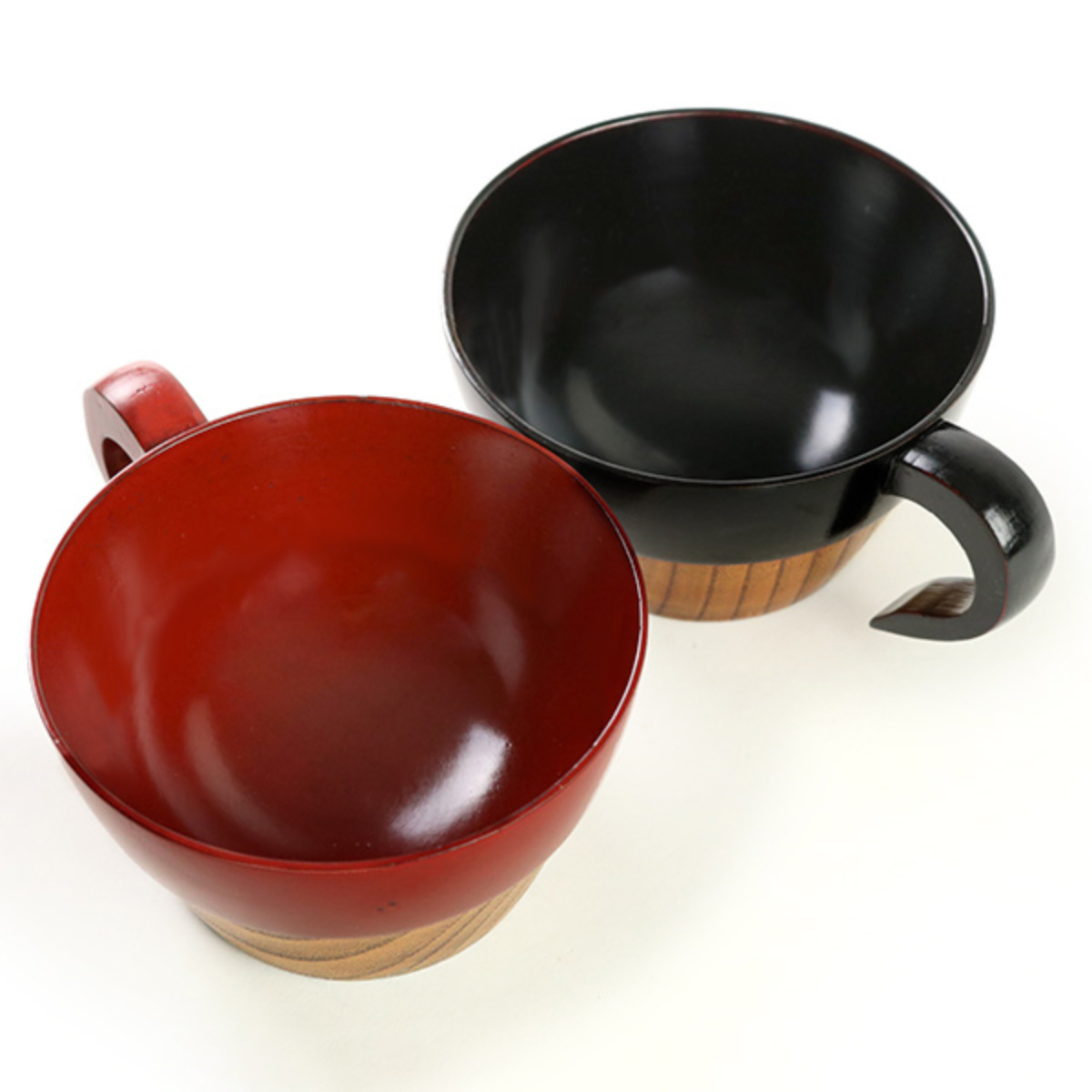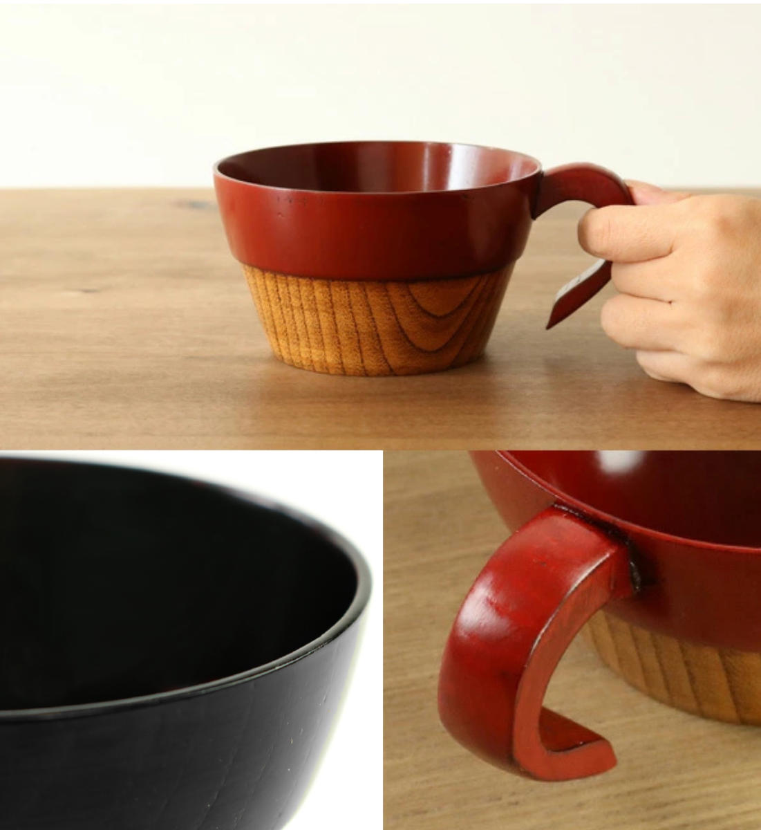 ●塗りの部分と木目部分のコントラストがおしゃれで、和にも洋にも合うスープカップです。