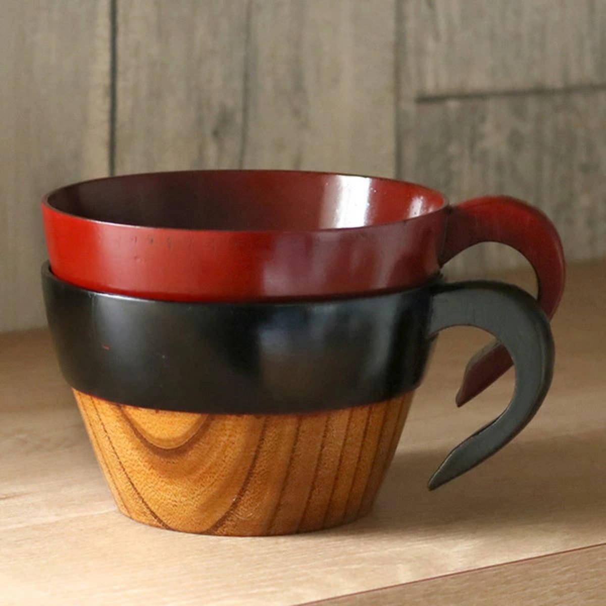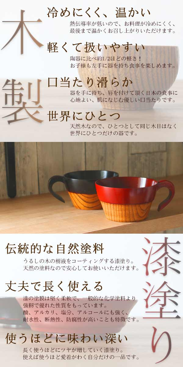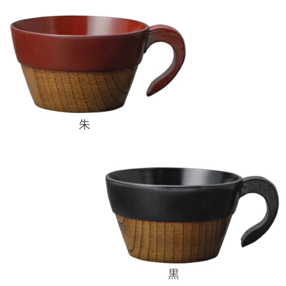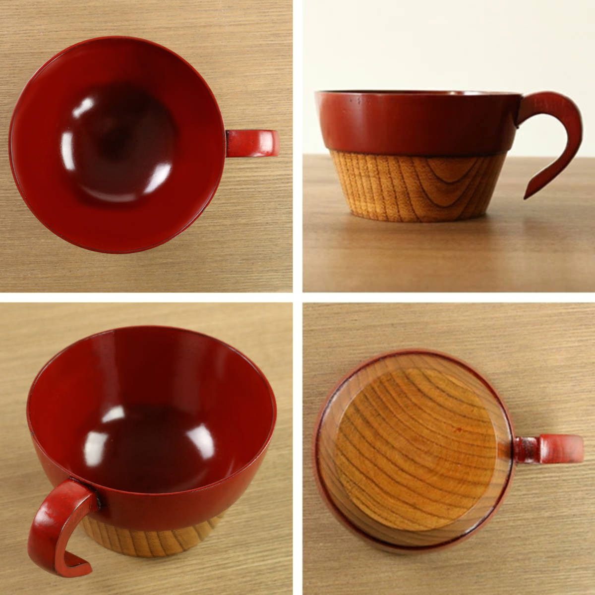 ●塗りの部分と木目部分のコントラストがおしゃれで、和にも洋にも合うスープカップです。