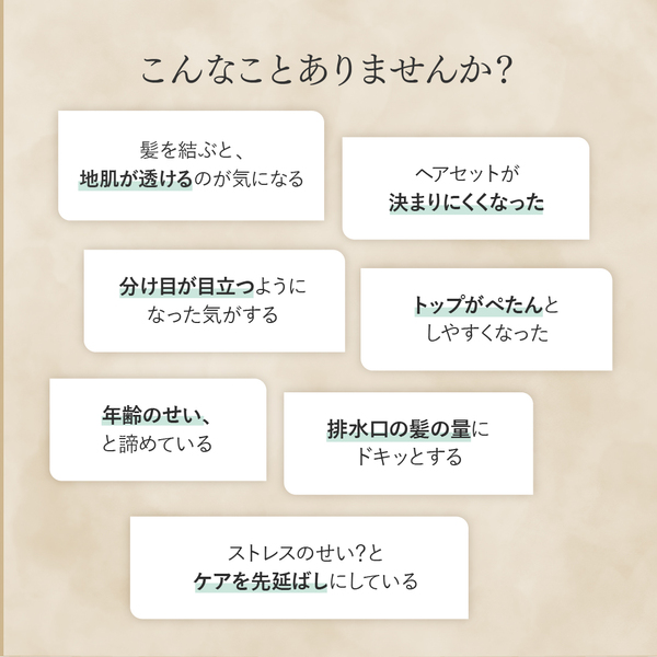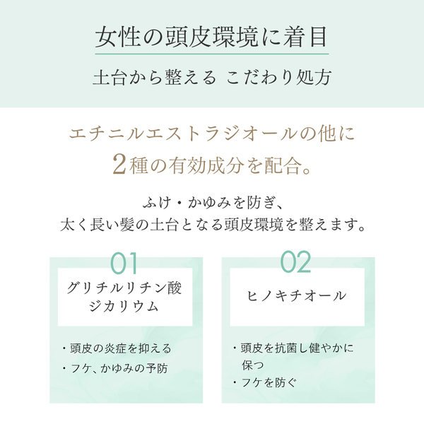 女性ホルモンを頭皮に補給し、育毛を促進。太く抜けにくい髪を育みます。