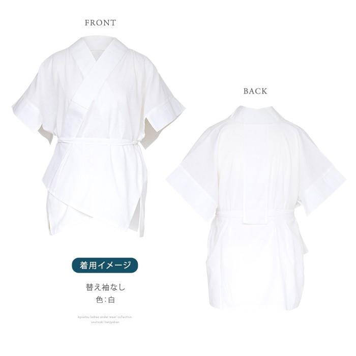 半襦袢タイプのうそつき襦袢です。お手持ちの裾よけやステテコと合わせてお使いください。お手持ちの裄丈が違う着物にも、この商品一枚でサイズを変更して使用していただけます。身頃は綿でできているので、肌触りやさしくお手入れも簡単です。