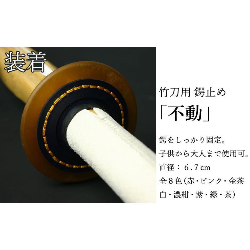 剣道 鍔止め つば止め抜群の人気を誇る「不動」鍔止め。全8色(赤・ピンク・金茶・白・濃紺・紫・緑・茶)子供〜大人まで使用可。鍔をしっかり固定してくれます!竹刀サイズにかかわらず使用可能ですが、柄太の竹刀など一部適合しない場合もございます。※柄革に多少黒い色が付着する場合がございますが、異常ではありませんので予めご了承下さい。