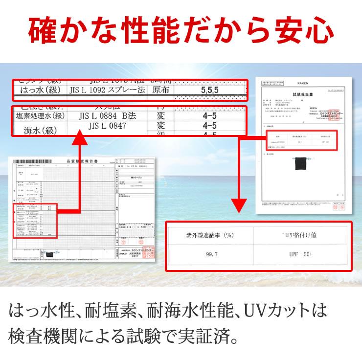 UVカット99.7%、UPF50+で紫外線から肌を守り、耐塩素加工で海水やプールの強い塩素でも劣化しにくいから長く使うことができる。