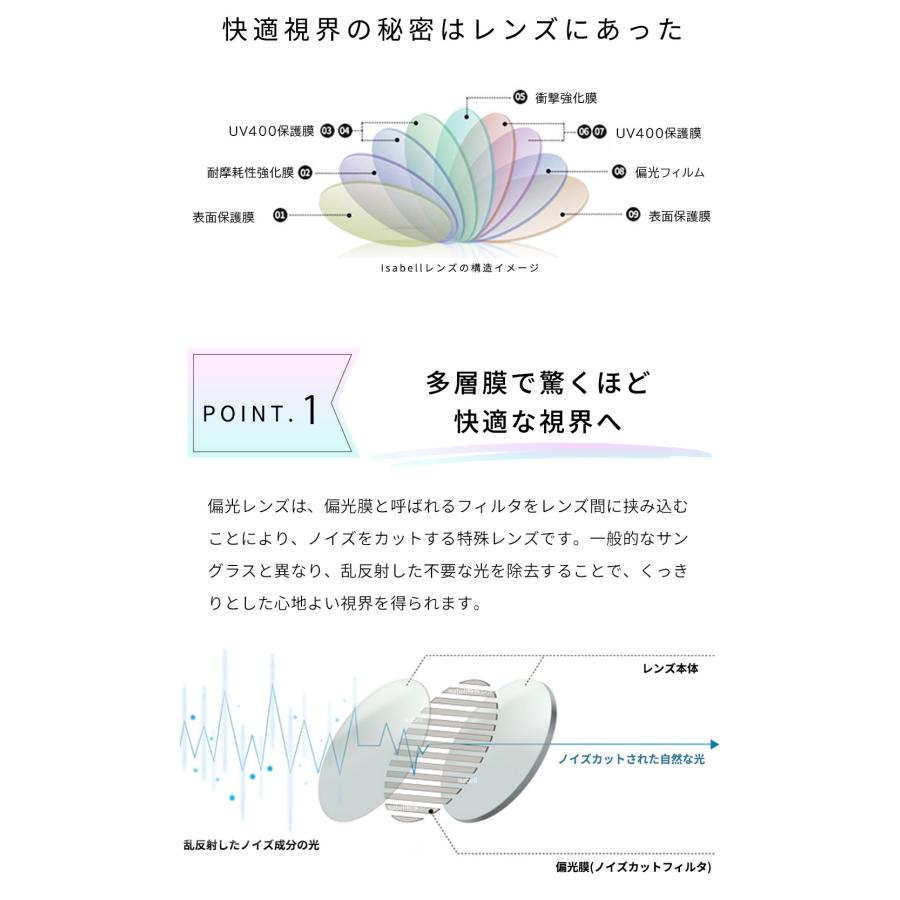 目や肌に有害な紫外線を遮断する高品質レンズを使用。また、反射光などのまぶしさの原因である偏光を効果的にカットできるので、光のまぶしさで目を細めることもありません。