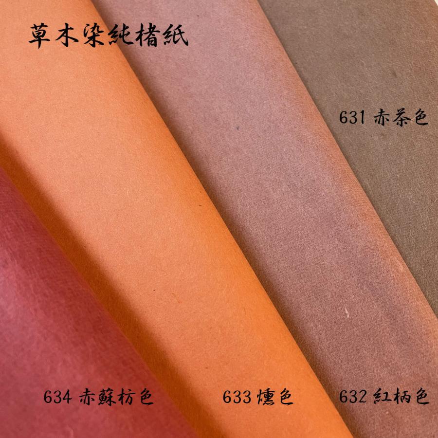 富山県八尾で漉かれている手漉きの染紙です。草木染めの純楮紙で、表面の手触りはほぼ滑らかですが、漉き込まれた繊維がふわふわっと表現され、風合いのある和紙です。草木染めならではの自然の色合いも好まれています。紙人形、ちぎり絵などのあらゆるクラフトにお使いいただけます。抄造の際に染料を調合するのでロットによる多少の色ブレがあります。また耳付きのため紙のサイズは一枚一枚若干誤差があります。サイズ: 636 x 939mm産地: 越中和紙備考: 手漉和紙(耳付)