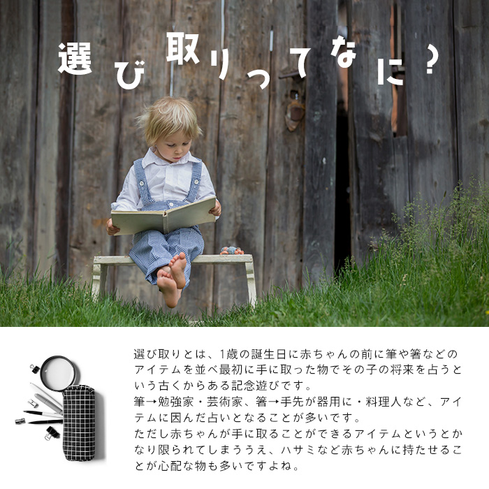 筆やそろばんなどを子どもの前に並べ、最初に手に取った物でその子の将来の職業を占うという伝統行事「選び取り」。