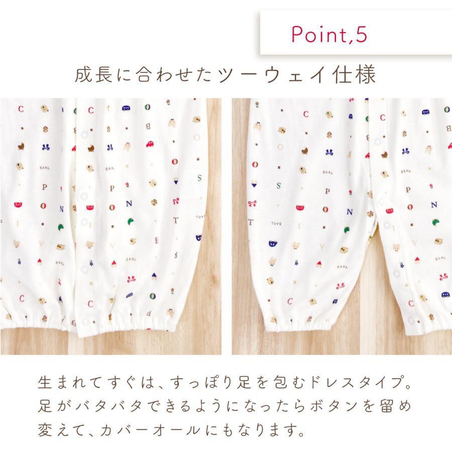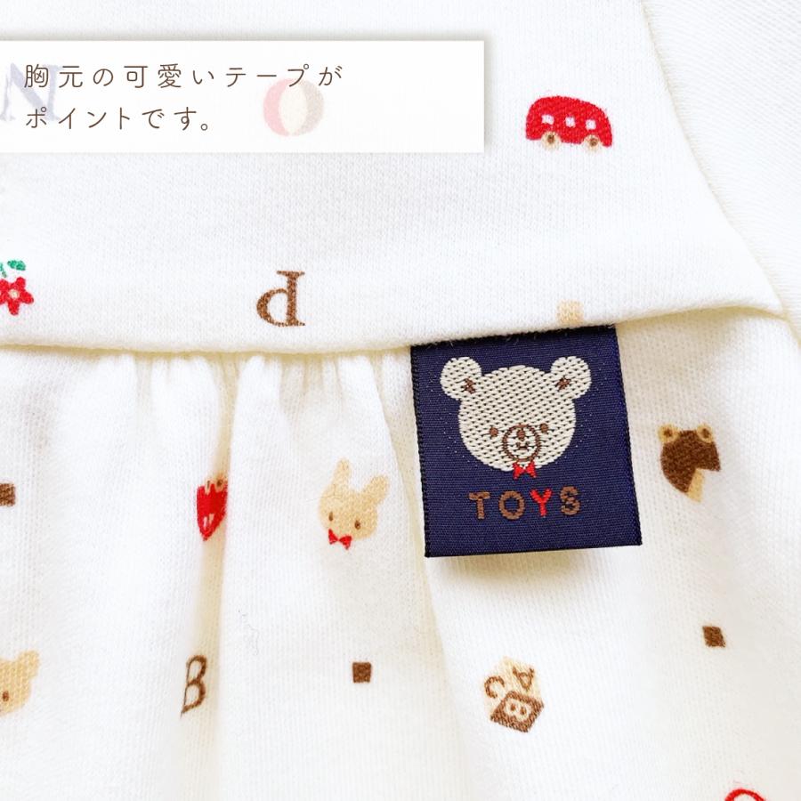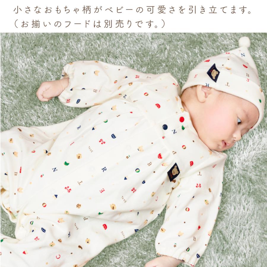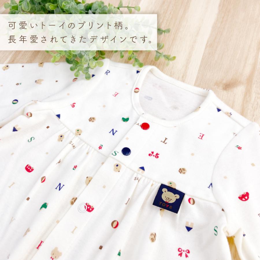 【商品名】ツーウェイオール トーイズ【素材/材質】綿100%(フライス)【色】アイボリー【サイズ】50〜70【その他商品説明】かわいいどうぶつとおもちゃが並んだ優しいアイボリー色のデザインで男女問わず着て頂けるアイテムです。 オールシーズンお使い頂けるフライス素材は、伸縮性があり、肌にフィットして汗を吸収してくれます。 生まれてすぐは足を包むドレスタイプ。 足をばたばた出来るようになったらボタンを留め替えて、カバーオールタイプにもなるツーウェイ仕様です。