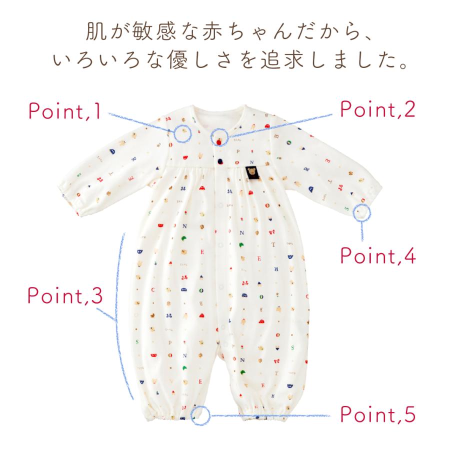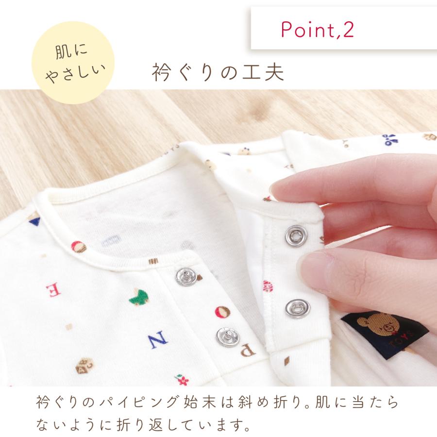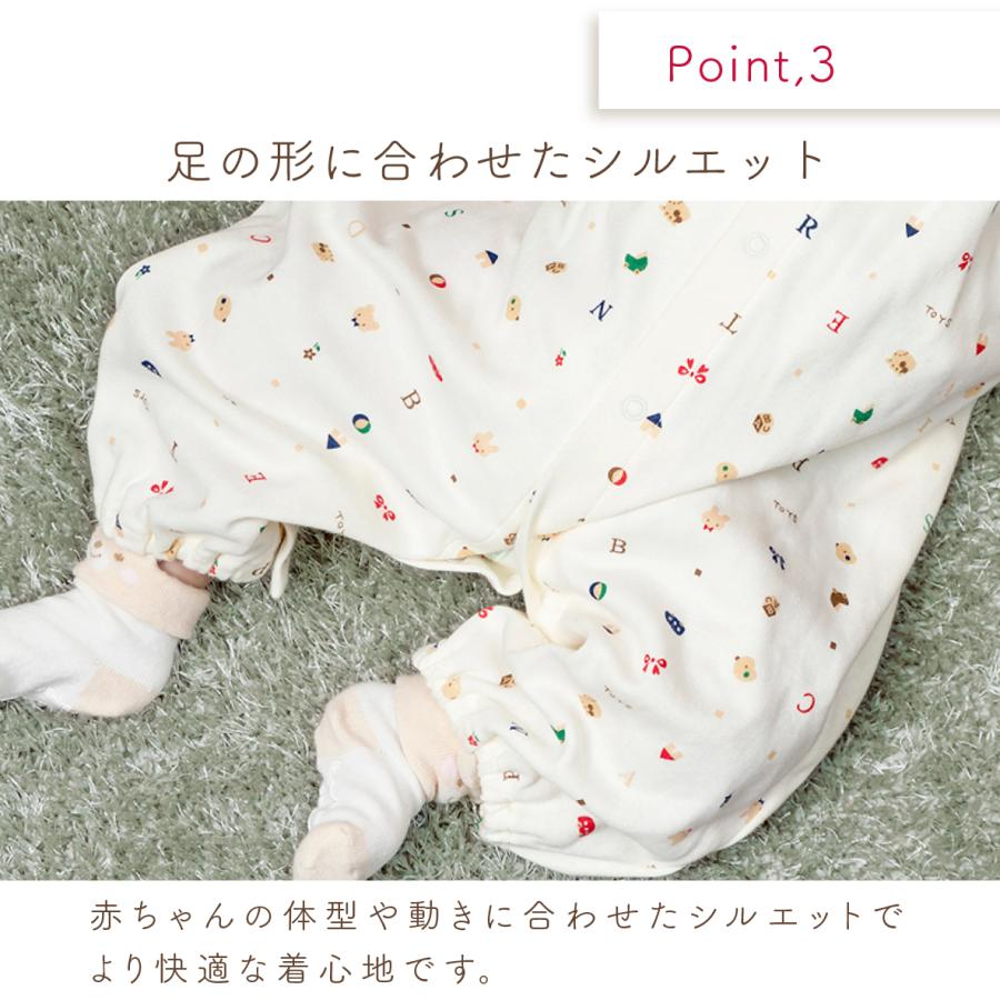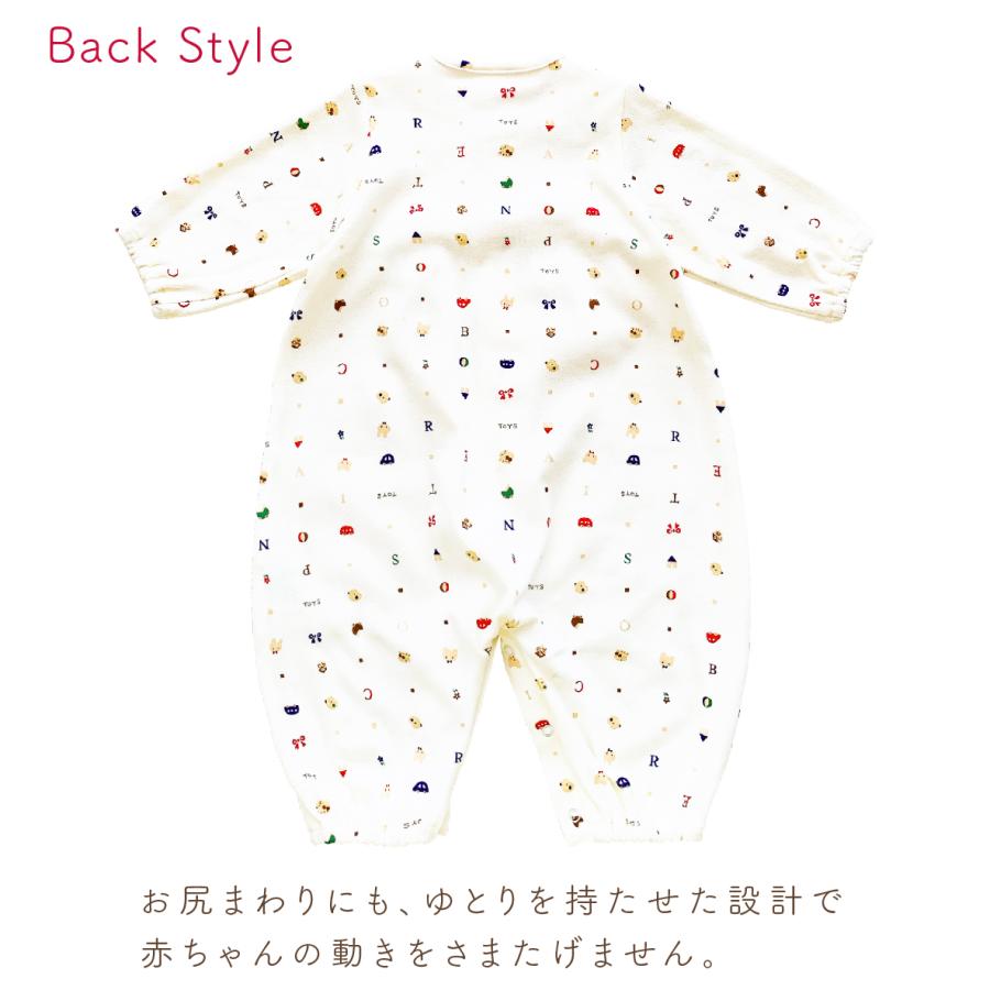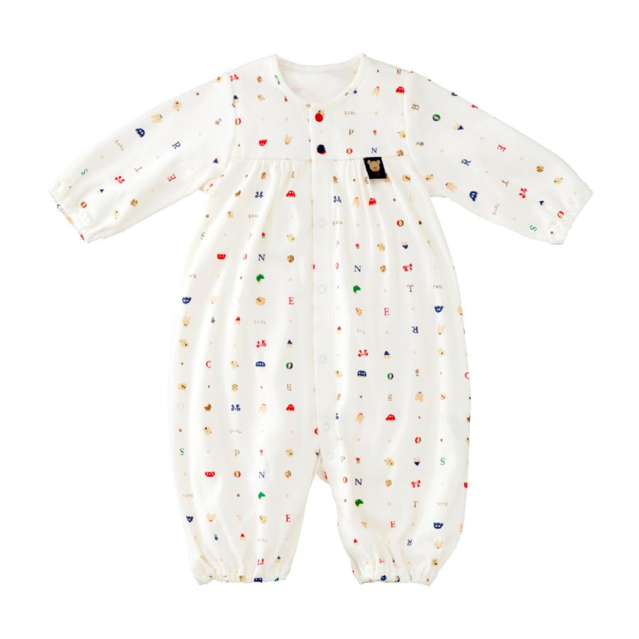 【商品名】ツーウェイオール トーイズ【素材/材質】綿100%(フライス)【色】アイボリー【サイズ】50〜70【その他商品説明】かわいいどうぶつとおもちゃが並んだ優しいアイボリー色のデザインで男女問わず着て頂けるアイテムです。 オールシーズンお使い頂けるフライス素材は、伸縮性があり、肌にフィットして汗を吸収してくれます。 生まれてすぐは足を包むドレスタイプ。 足をばたばた出来るようになったらボタンを留め替えて、カバーオールタイプにもなるツーウェイ仕様です。