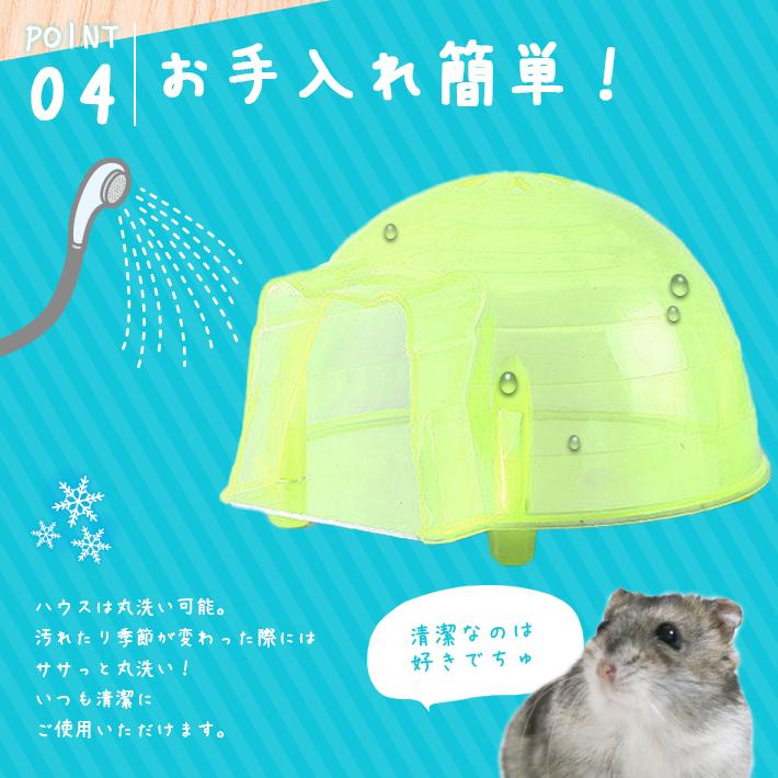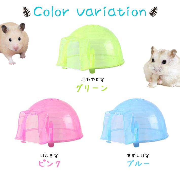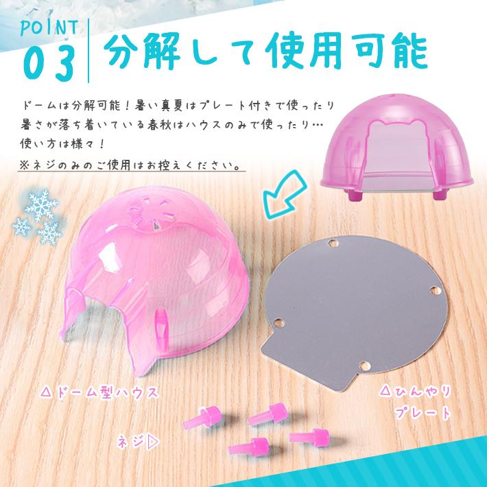 【商品概要】ひんやりプレートが付いたハムちゃんのお家・ひんやりハムスターハウスです。空気穴付きで通気性も抜群!狭い所が好きなハムちゃんが安心してお休みできるドーム型です。透けて見えるので、中の様子も確認しやすいです。ドームは分解可能で丸洗いOK♪【素材】プラスチック、他