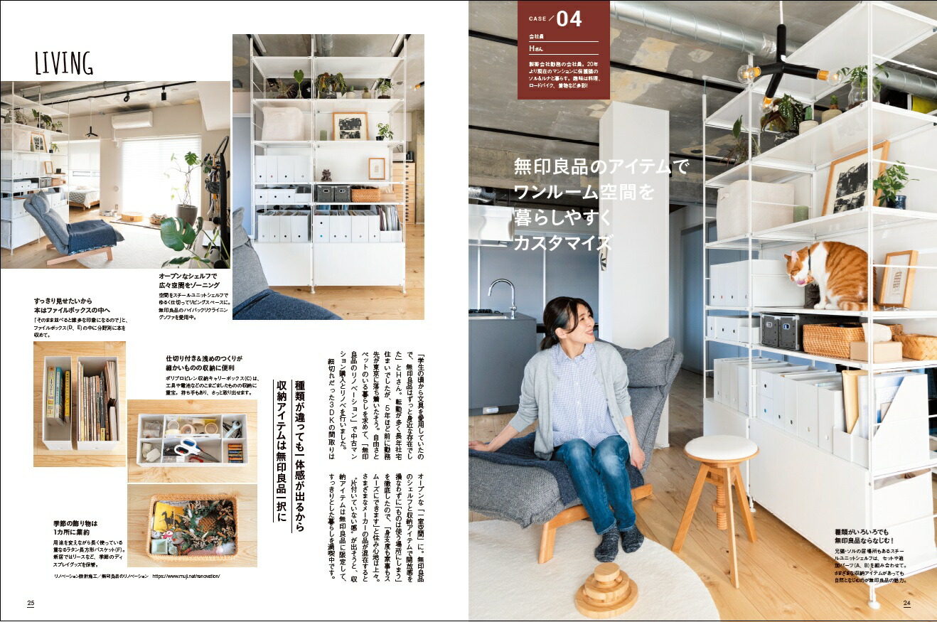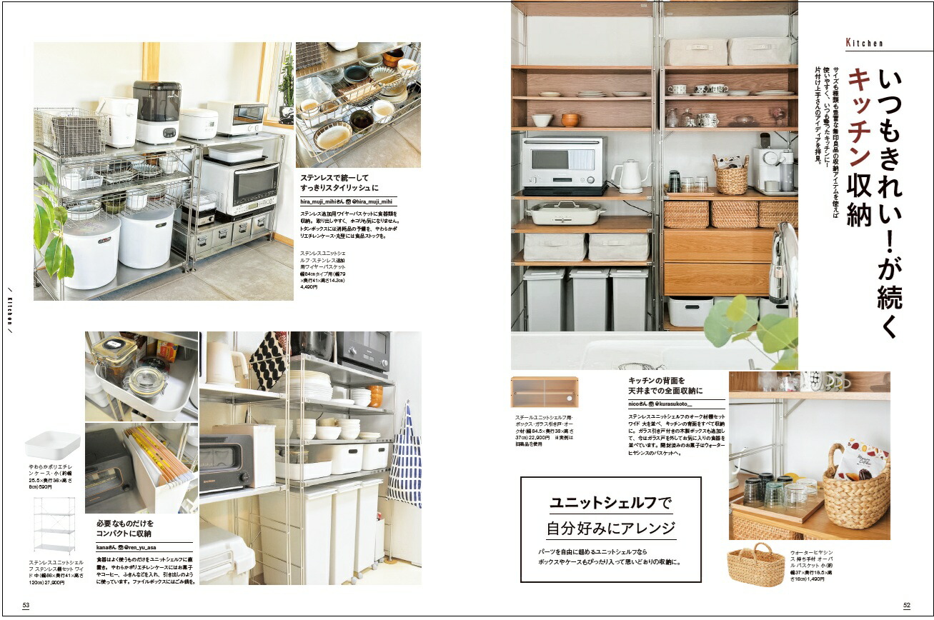 累計13万部! 一番売れてる無印良品の収納ムック第4弾! キッチン、水回り、クローゼット、キッズスペースなどの場所別に、無印良品の収納用品の使い方を収納達人60人の実例で紹介! 引き出しや棚の中の実例もたっぷり。散らかりがち、ごちゃつきがちな場所を頑張らずにすっきり片付ける驚きのヒント満載です。使っている無印良品のアイテム名もわかるから、すぐマネできる!初めての一人暮らしや二人暮らし、男性やシニアにもおすすめです。
