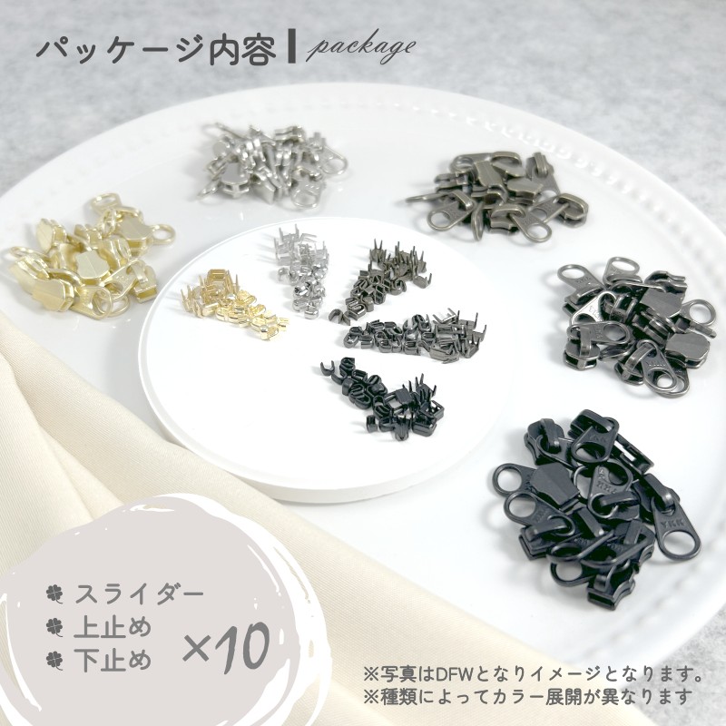 エレメントが金属でできている、YKKスタンダードファスナー専用スライダーセットです。上止め、下止め、DFWスライダーの10組入りセットとなります。商品詳細は下記説明欄よりをご確認ください。