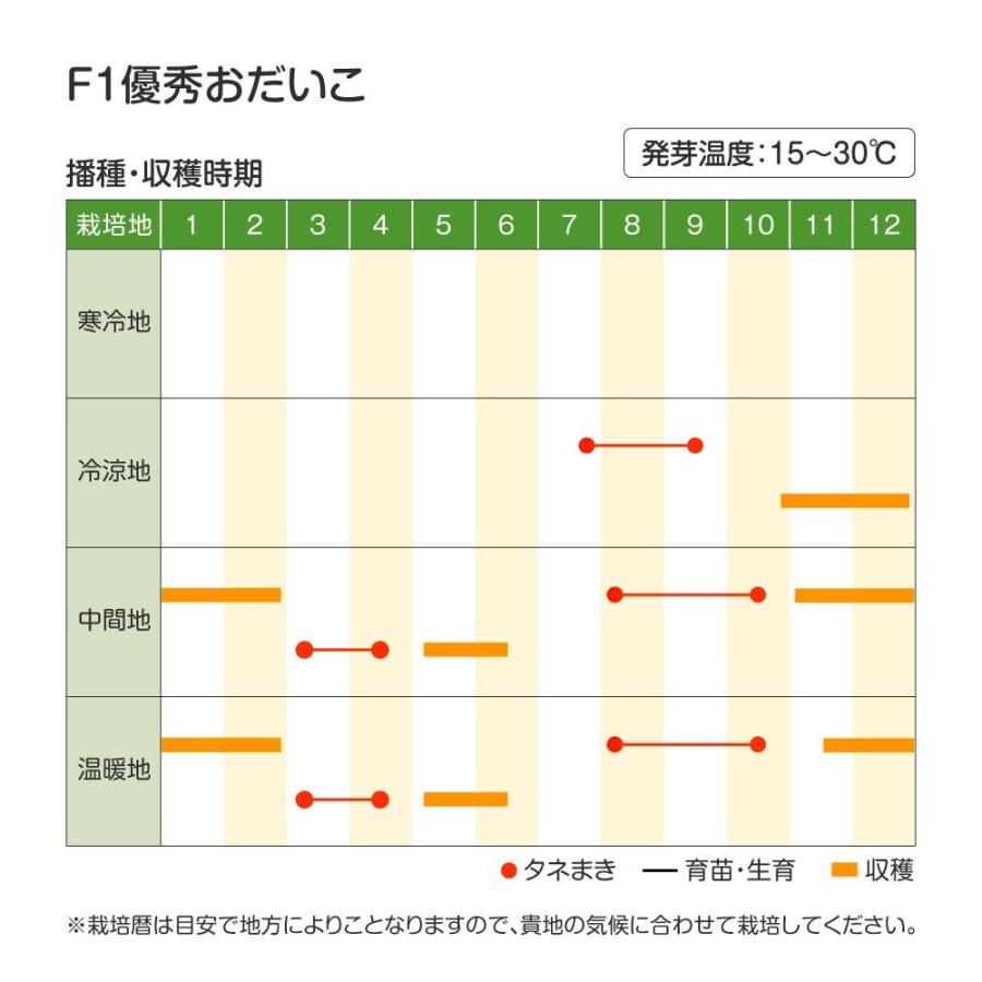 なんと、夏・秋・春の3季まきできる優秀大根。肉質緻密で甘味が強くとってもジューシー! どのまき時期でも美味しく作れますが、冬収穫なら糖度5度以上になることも(通常、大根は糖度5度あれば旨いと言われています)!! また、寒い時でも安定した肥大性をもち、イオウ病耐病性をもつ他、高温期にはウイルス病や軟腐病にかかりにくいので、とっても栽培簡単!