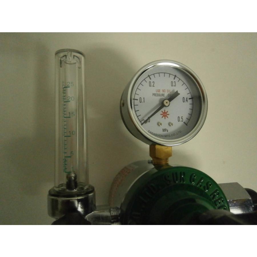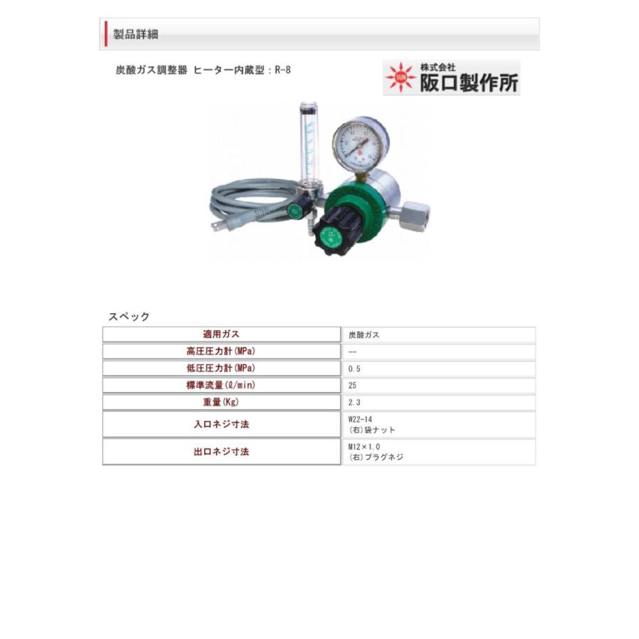 阪口製作所 炭酸ガス調整器 ヒーター内蔵型 R-8適用ガス:炭酸ガス高圧圧力計:−低圧圧力計:0.5MPa使用範囲圧力:0.1〜0.3MPa標準流量:25L/min重量:2.3kg入口ネジ寸法:W22-14(右)袋ネット出口ネジ寸法:M12x1.0(右)プラグネジ※ホースショイント6Φ、8Φを どちらも必要な方は、別途ホースジョイントセットをご購入ください。