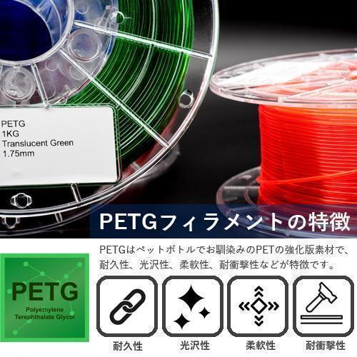 品目:3Dプリンター用PETGフィラメント素材カラー:黒サイズ:1.75mm正味重量:1KG印刷温度:200〜240°特徴 :高強度状態 :コイル状PETGフィラメントの特徴PETGはペットボトルの素材としてお馴染みのPETの強化版です。耐久性、柔軟性、耐衝撃性、光沢性が特徴です。ABS樹脂とPLA樹脂の短所をカバーしつつ長所を併せ持ち、熱収縮性は低く、歪みや反りは起きにくいです。コスパにも優れています。