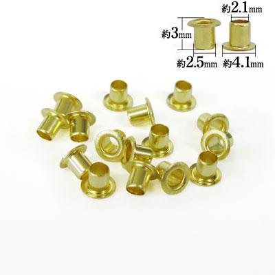 ハトメの筒の部分が直径2.5mmハトメ。金属の厚みがありますので、取付けた後の穴の内径は約2.1mmとなります。高さが3mm。真鍮製で座金は付属されません。ハトメ本体のみでお使いいただく電気ハトメです。取付対象の厚みが1mm以下のものにご使用いただけます。