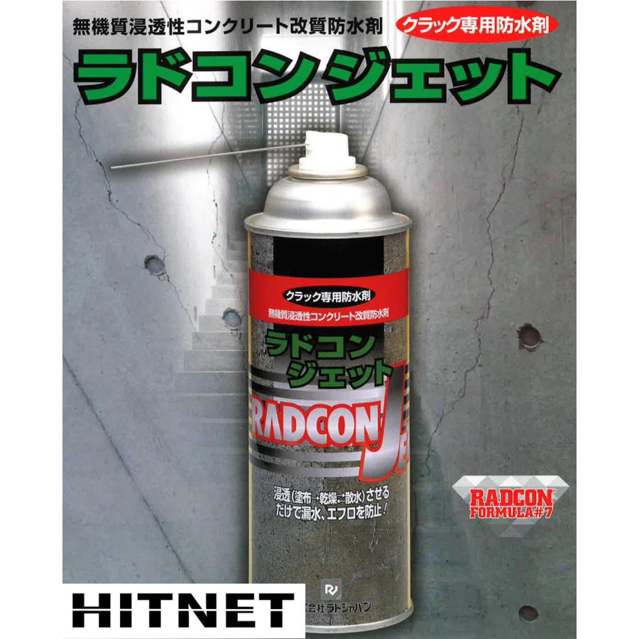 【特徴】ラドコンジェットは無機質浸透性コンクリート改質防水剤ラドコン7シリーズのクラック補修専用防水剤です。スプレー式で手軽に簡単施工でき、内容物はラドコン7なのでラドコン7と同じ効果が得られます。【製品概要】・内容物:ラドコンフォーミュラー#7(ラドコン7)・外観:無色透明液体・沸点:101℃・比重(25℃):1,225・引火点:原液に引火点はありません・PH:11,23以上・主要成分:ケイ酸系ナトリウム(けい酸塩系表面含浸材)【荷姿】330ml/スプレー缶