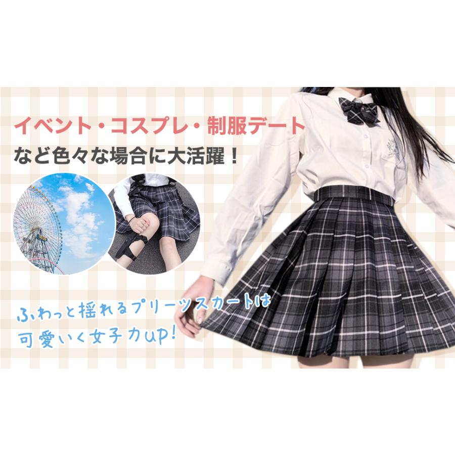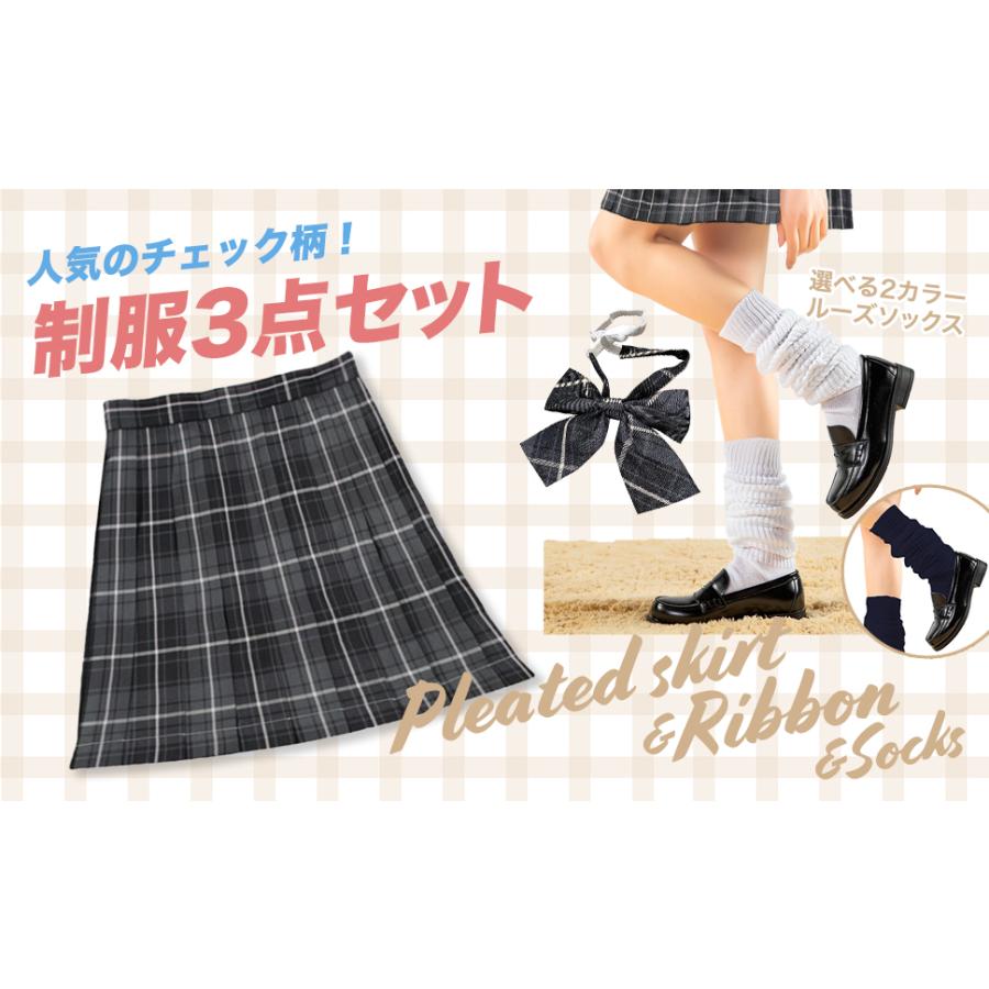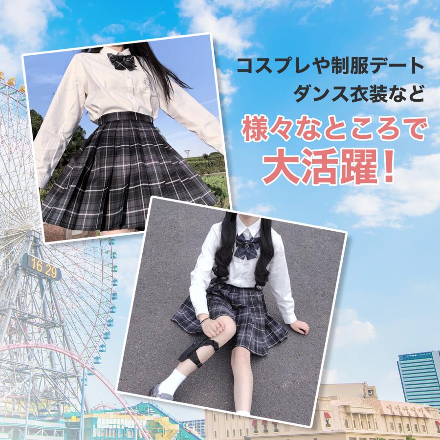 制服風チェックプリーツスカート、ホワイトシャツ、ルーズソックスの3点セット。女子高生風スタイルが簡単に完成し、制服ディズニーやUSJコーデ、コスプレ、学園祭、パーティー、クラブイベントなど様々な場面で活躍。スカートは調整バックル付きでサイズ対応◎。ソックスは約60cmでボリューム感たっぷり。TR素材使用でしわになりにくく、長く使えるのもポイント。若見え&可愛い印象に。