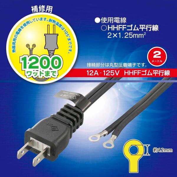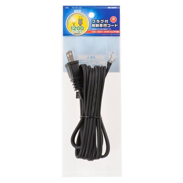 オーム(OHM)オーム電機 プラグ付き耐熱コード 補修用 2m HS-HT1-02 06-5347商品コード:16075562471型番:HS-HT1-02サイズ:2mカラー:ブラック【 特 長 】 熱器具用の電線を使用しています 耐熱温度は105[度]までです 接続部分は丸型圧着端子です【 仕 様 】 使用電線:HHFFゴム平行線(2×1.25mm2) 定格:12A-125V(1200W) コード長:2m≪ご注意≫※ 1200ワット以下でお使いください。