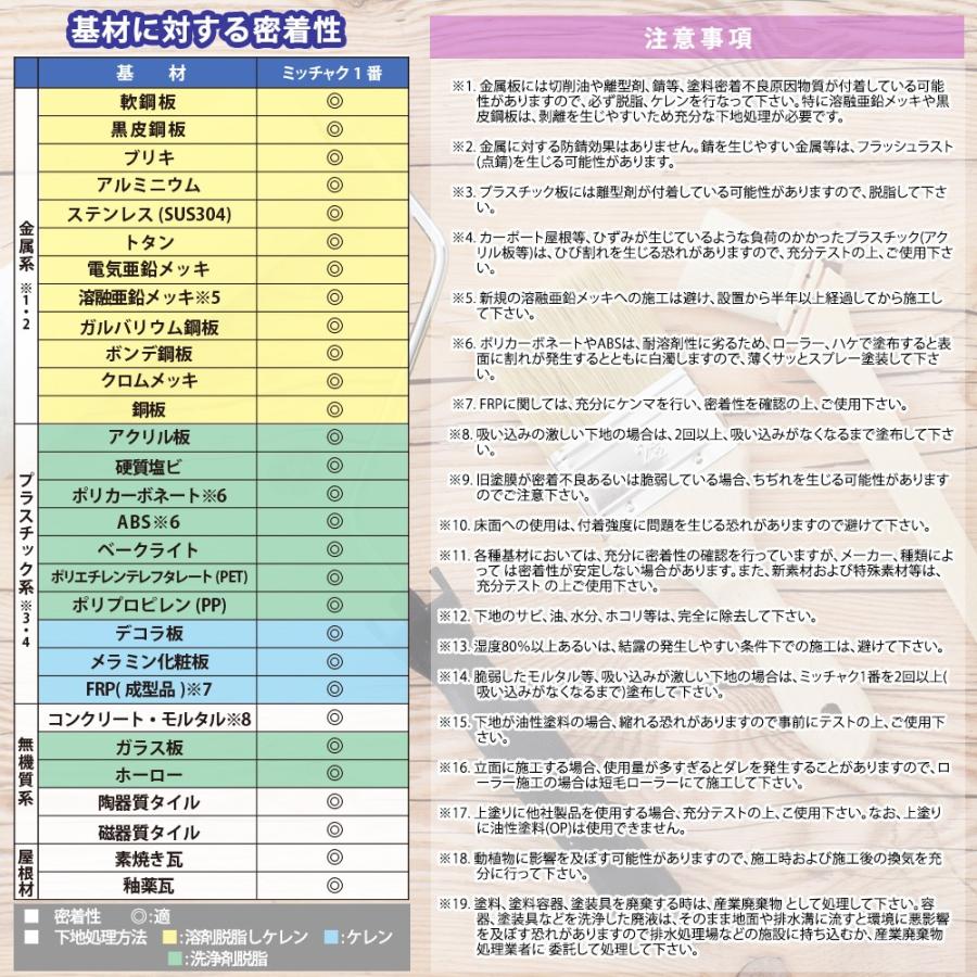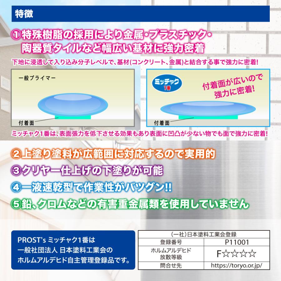 ※PP素材対応・一液タイプの超速乾ホルムアルデヒド放散等級:F☆☆☆☆(一社)日本塗料工業会 登録番号P11001(商品内容)●ミッチャク 1番 2L【用途】 1.一般用内外壁の塗り替え 2.トタン・アルミ・ステンレス等の金属面への下塗り 3.陶器・磁器タイル・釉薬瓦などへの下塗 4. アクリル系・塩ビ系、ウレタン系、エポキシ系等の塗り替え用プライマー【検索キーワード】密着剤 ミッチャク ミッチャク液 ミッチャクロン プライマー