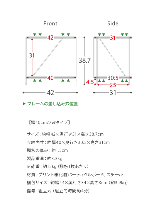 ■お届け目安(ご予約販売除く)※2営業日後出荷→ご注文からお届けまで4〜7日程【幅40cm/2段タイプ】【サイズ】約幅42×奥行き31×高さ38.7cm【収納内寸】約幅40×奥行き30.5×高さ31cm【棚板の厚み】約1.5cm【製品重量】約3.3kg【耐荷重】約15kg(棚板1枚あたり)【材質】プリント紙化粧パーティクルボード、スチール【梱包サイズ】約幅44×奥行き34×高さ8cm(約3.9kg)【備考】組立式(組立て時間約4分)【カラー】ブラウン/グレー/ナチュラル