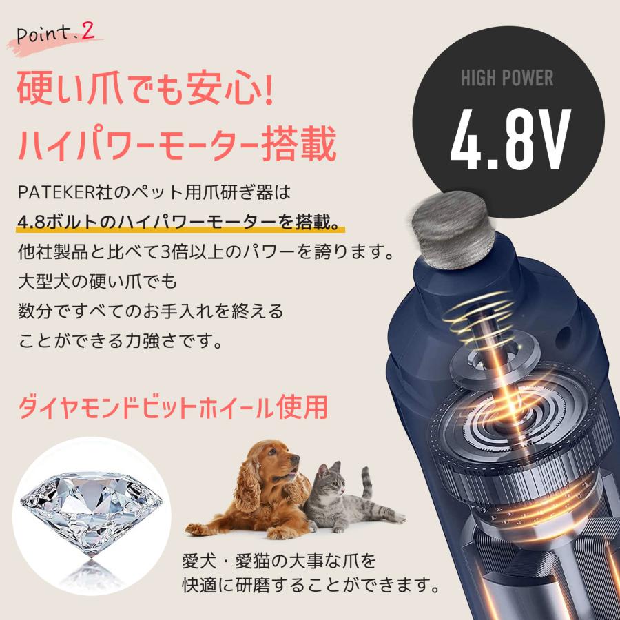 【高性能モーター】PATEKER社のペット用爪研ぎ器は、4.8ボルトのハイパワーモーターを搭載。他社製品と比べて3倍以上のパワーを誇ります。硬い爪でも安心です。