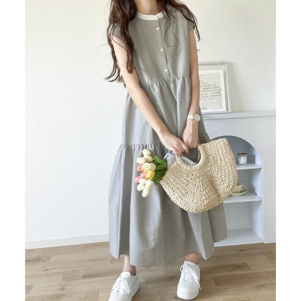 キーワード:ワンピース ストライプ ティアード ノースリーブ リボン ロング 無地 WEB限定 ナチュラル ピクニック レジャー ベーシック 夏 公園 春 大人カジュアル 定番 旅行