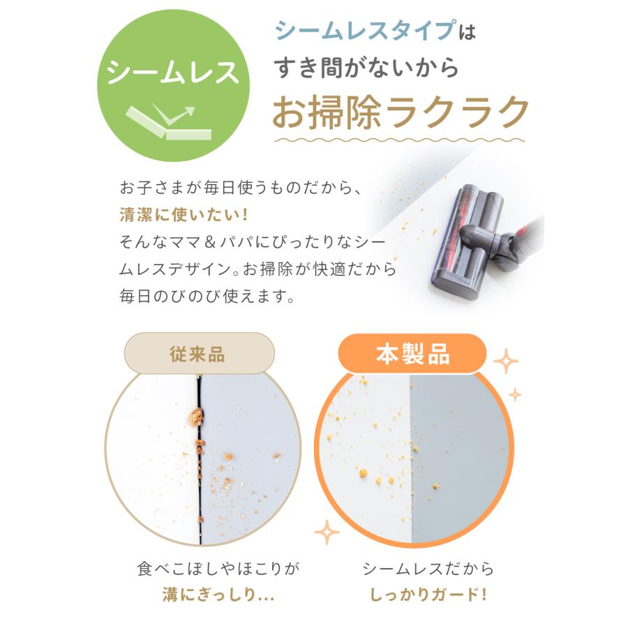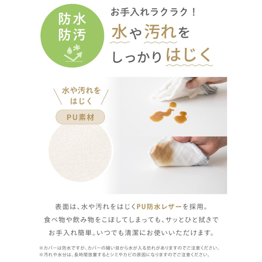 プレイマットの表面は、水や汚れをはじくPU防水レザーを採用。食べ物や飲み物をこぼしてしまっても、サッとひと拭き。※カバーは防水ですが、カバーの縫い目から水が入る恐れがあります。※汚れや水分は、長時間放置するとシミやカビの原因になります。