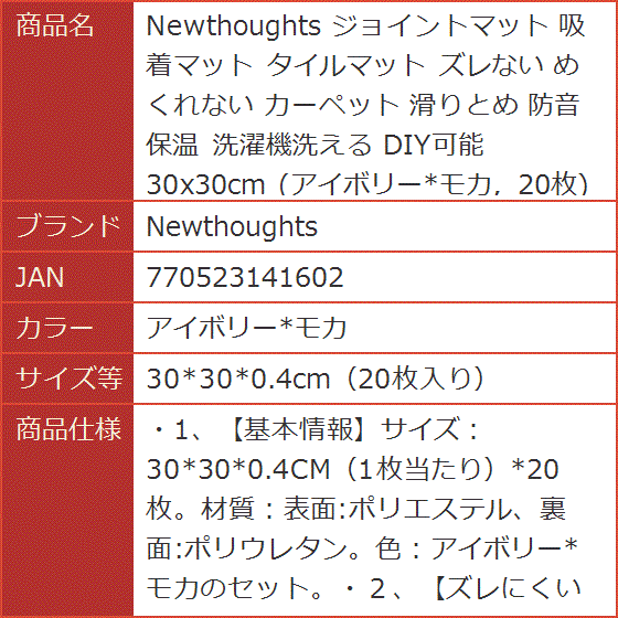 ・1、「基本情報」サイズ:30x30x0.4CM(1枚当たり)x20枚。