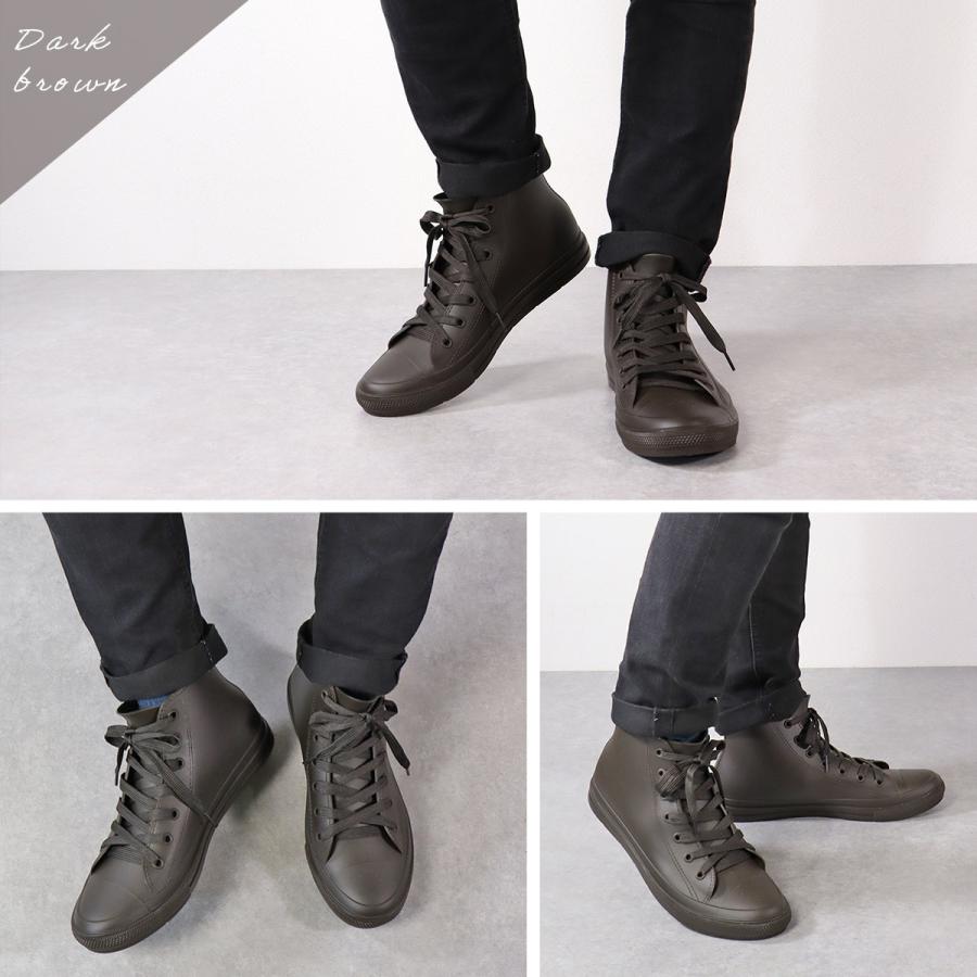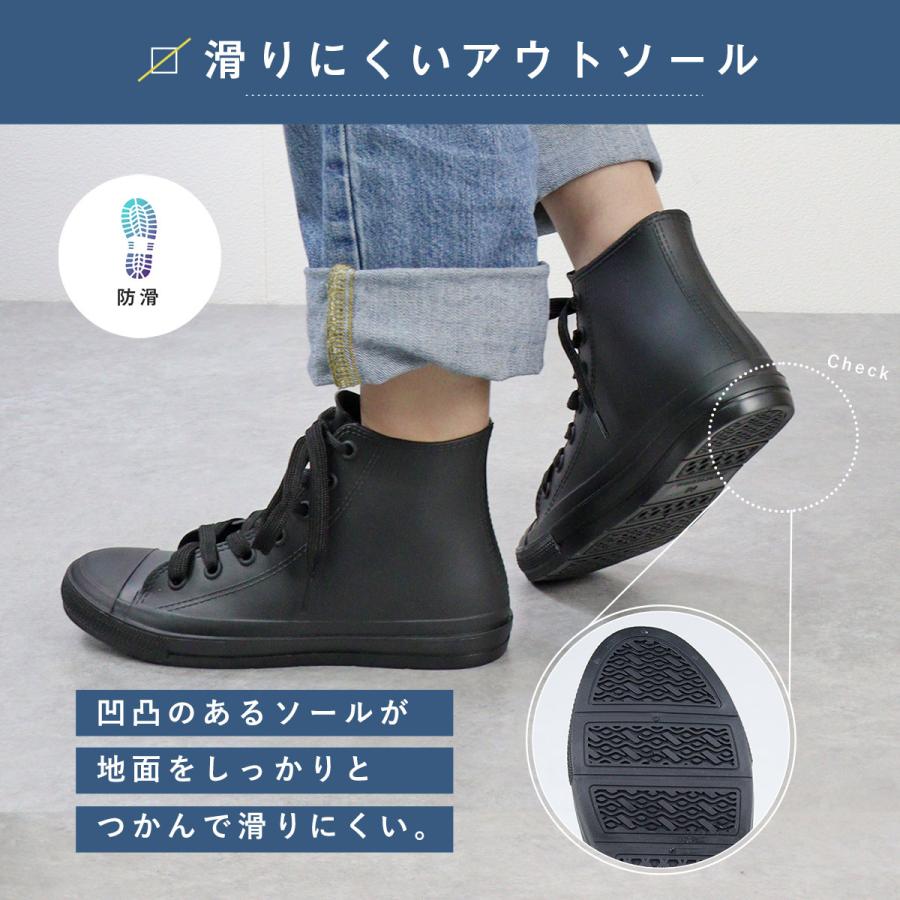 【AAA+ サンエープラス】のレインスニーカー。縫い目のない一体型成型のレインシューズ。完全防水なので雨の日でも快適にお出かけできます。内側はさらりとした素材でムレにくく、肌にくっつく不快感もありません。インソールは取り外せるので洗えてとっても衛生的。ハイカットタイプなので幅広いスタイルに合わせやすく、急な雨でも安心です。