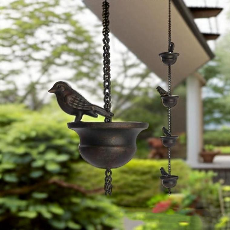 雨樋 雨どい 鎖樋 縦樋レインチェーン カップ上の鳥 側溝縦樋 モバイル 7.8フィート ダークブロンズ 付属ハンガー 4/6/8個カップとフック付き 雨水ダイバーター
