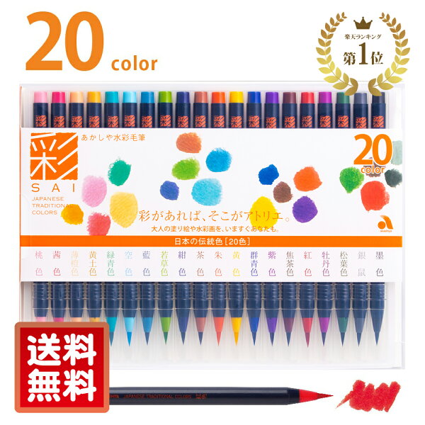 メール便送料無料!あかしや水彩毛筆「彩」20色セット カラー筆ペン カラーペン 画材 カラフル プレゼント 混色 グラデーション 水彩画 ぼかし スケッチ イラスト 絵手紙 カリグラフィー ハンドレタリング 大人の塗り絵 写経 伝統色 色筆ペン 絵はがき 水性染料