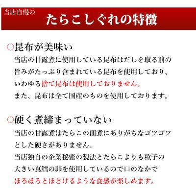 原材料:マダラの卵巣(アイスランド産又はアメリカ産)、昆布、砂糖、醤油、粉末水あめ、黒糖、発酵調味料、ぶどう糖果糖液糖、蛋白加水分解物、でん粉、