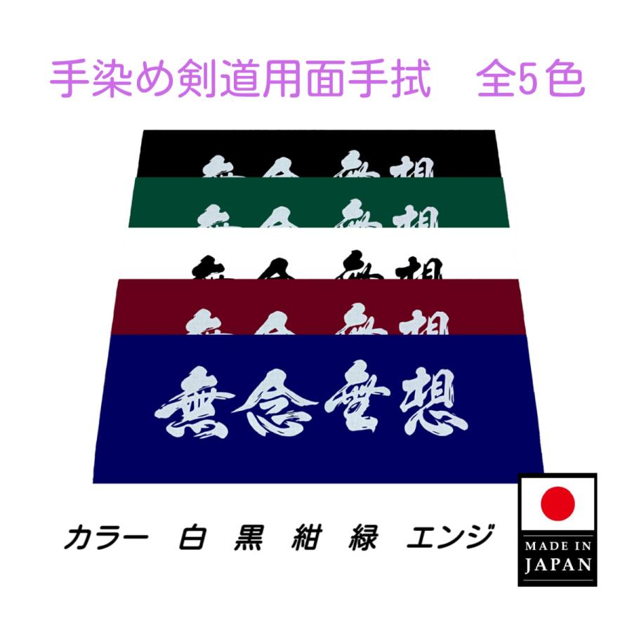 手染め剣道用面手拭 【無念無想】ですサイズ 100×36センチ全5色 白 黒 紺 緑 エンジ お好きな色をお選び下さいなおこの商品は普通郵便での発送となります土曜日、日曜日、祝日の配達がありませんので到着が概ね3日〜7日と比較的時間が掛かりますお急ぎのお客様は有料でゆうパケット便、レターパックプラス、宅配便にての出荷をご利用下さい