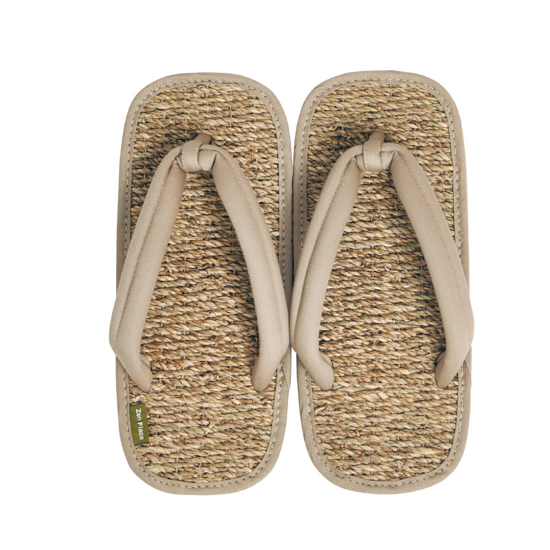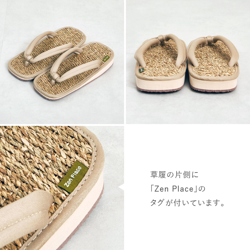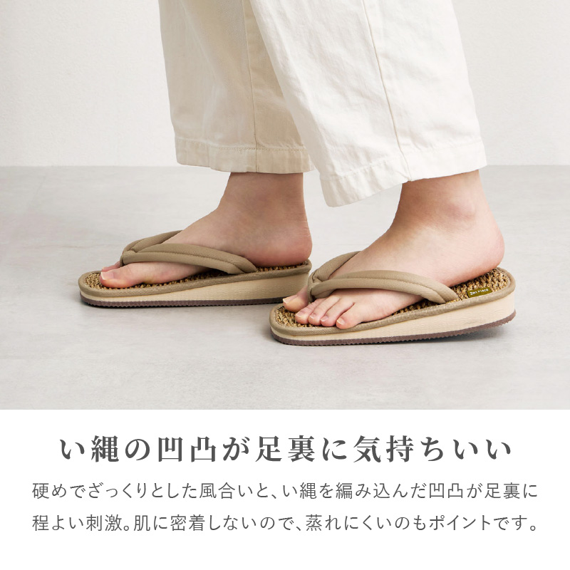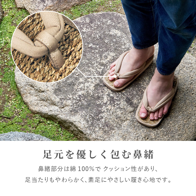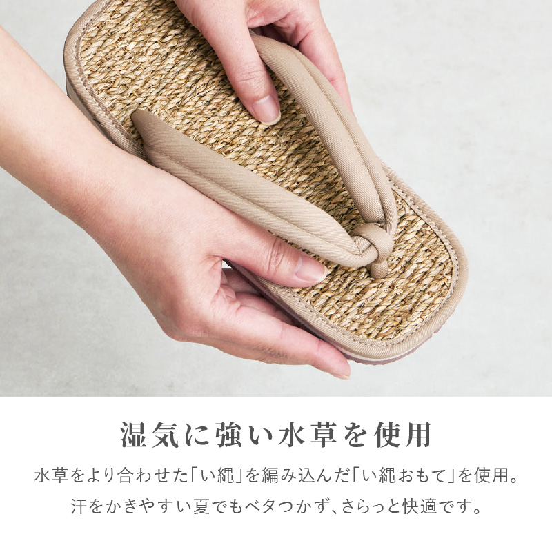 足の裏に触れる部分に水草を使用した、日本製のい縄草履。湿気に強く耐久性に優れたベトナム産の水草を縒り合わせた「い縄」を編み込んだ「い縄おもて」を使用し、倉敷で一つひとつ丁寧に仕上げています。ナチュラルな色合いと見た目で自分専用の普段使いやプレゼントにもおすすめです。