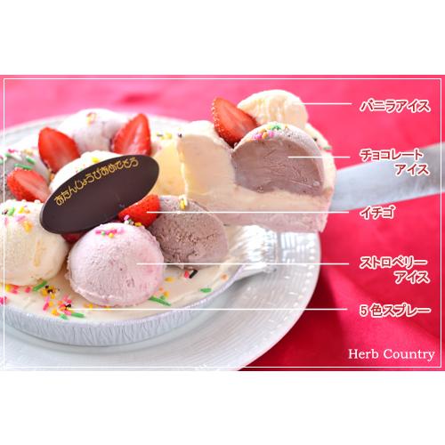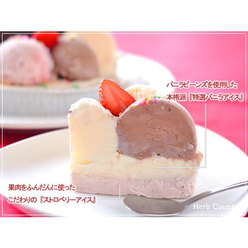 土台はストロベリーとバニラアイスが2層にサンドされ、上部のトッピングアイスはチョコレート、ストロベリー、バニラアイスが盛り付けられております。