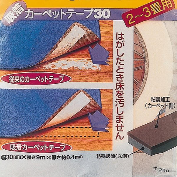 特殊吸着加工(ミクロ吸盤)で吸着固定させるラグ・カーペットテープです。カーペット側には粘着加工を使用し、床側には粘着剤をまったく使っていないので床面に優しくフィットします。床側には粘着剤が無いので、床を傷めずノリ残りの心配もありません。 【商品詳細】サイズ/約幅30(mm)×長さ9(m)×厚さ0.4(mm) 内容量/1巻 材質/基材:不織布 吸着面:アクリル発泡体 粘着剤:アクリル系粘着剤 はくり紙:紙 生産国/日本製 備考/2〜3畳用 《ラグ カーペット 絨毯 マット ラグマット 吸着テープ ズレ防止 ズレ予防 すべり止め リビング ダイニング 室内 屋内 部屋 おすすめ オススメ 便利 生活用品 日用品 雑貨》