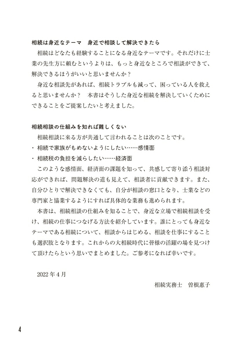相談者の悩みを見える化し、わかる化する。相続を仕事にする、という選択肢。 相続関連のお仕事は、法律の専門家でないとできないと思っていませんか? 身内や知り合いの話を聞いたり、相続に関わったりしたことがある人は 「相続って弁護士鞘税理士さんが出てきて、たくさんの手続きをするから難しそう」 と思っている事でしょう。 しかし、実は相続で一番重要なことは、ご家族が亡くなる前に 亡くなった後のことを「相談」するところにあるのです。 その理由は本書で説明していますが、相続でもめないため、幸せな 相続を実現するために「相続実務士」という仕事が生まれました。 本書では、相続の仕事とは何か? からはじまり、 実務を理解できるよう、事例を多く取り入れて紹介しています。 相続をコーディネートする「相続実務士」には、弁護士などの法律の専門家レベルの知識は不要。 むしろ、「相続士」には話しにくい相談に乗ることが仕事になるのです。 ≪こんな人におすすめです≫ ・既存のビジネスだけでは食べていけるか不安 ・なにか民間資格をとって仕事の範囲を広げたい ・不動産関連の資格はあるけど、活かせていない ・相続を経験して、士業とトラブルになりいい思い出がない