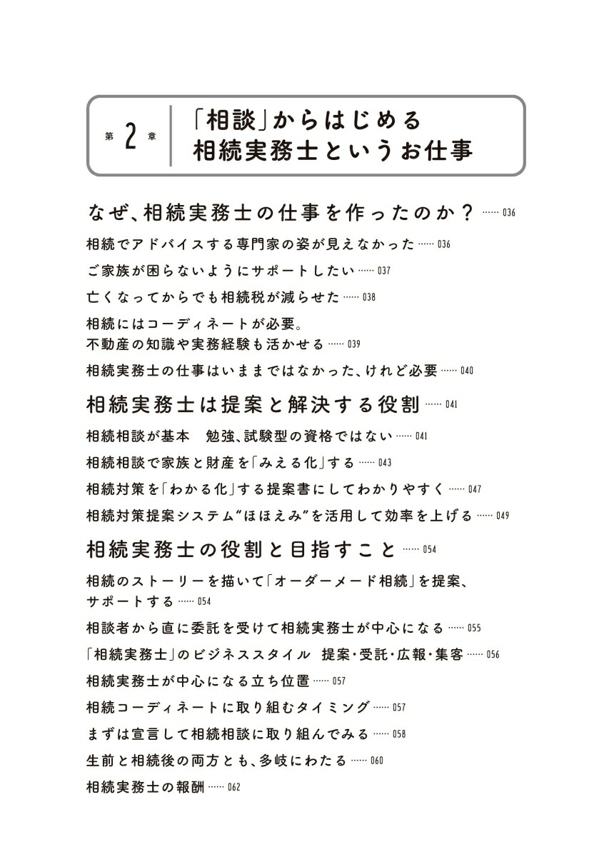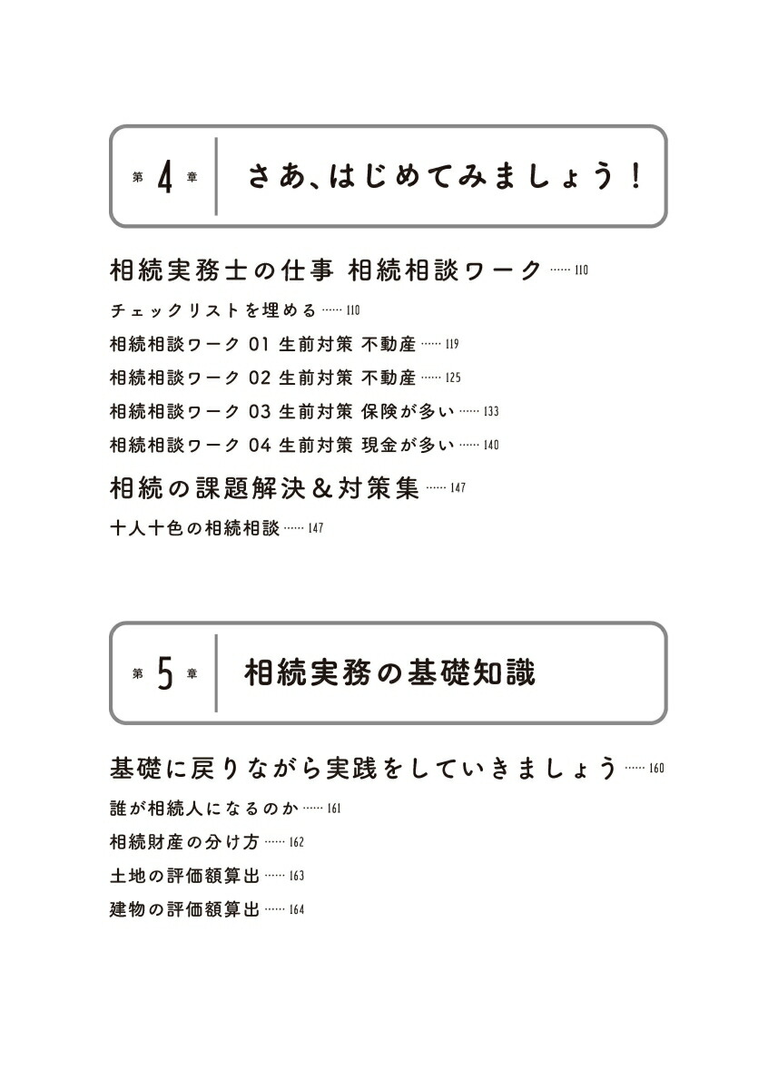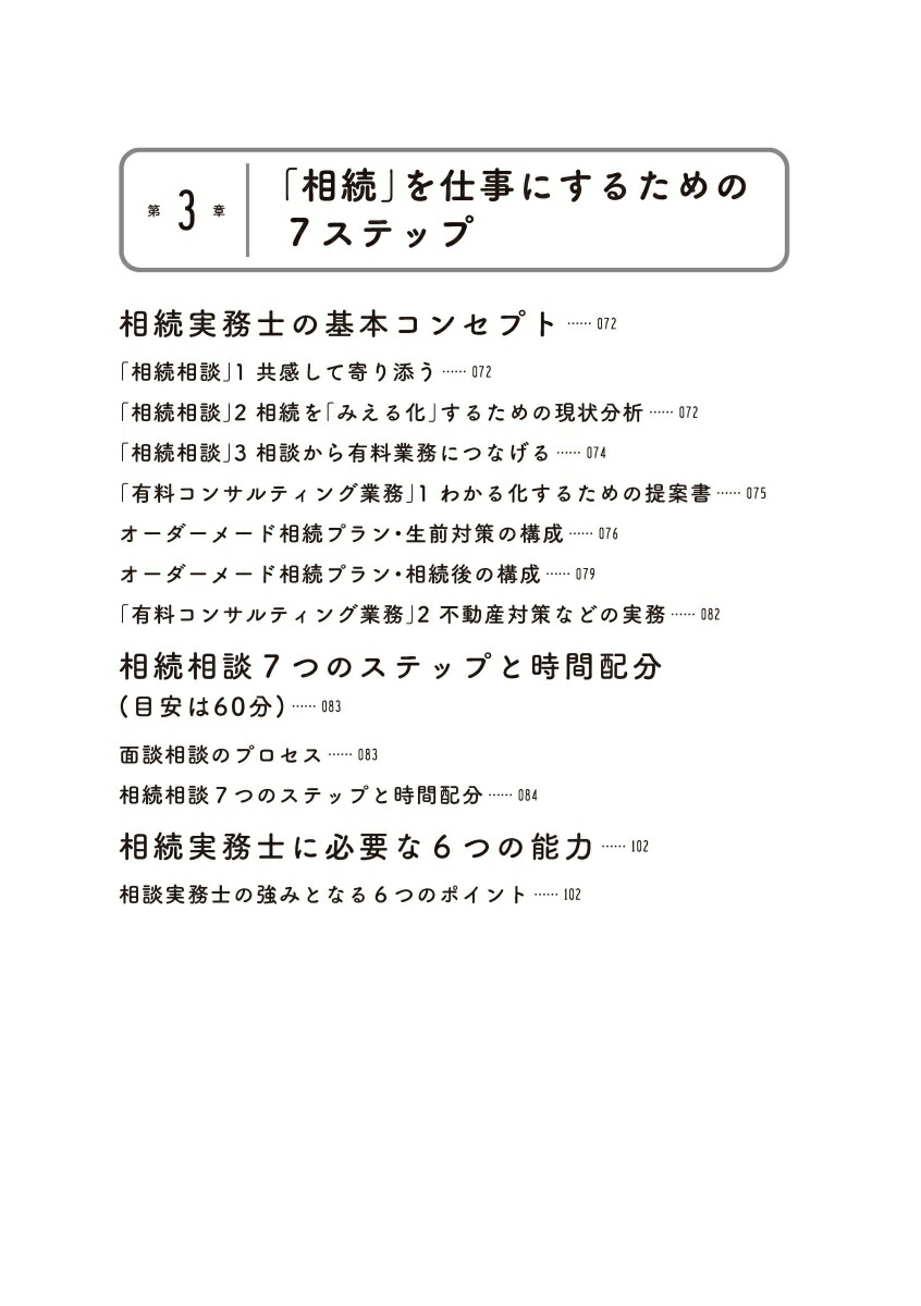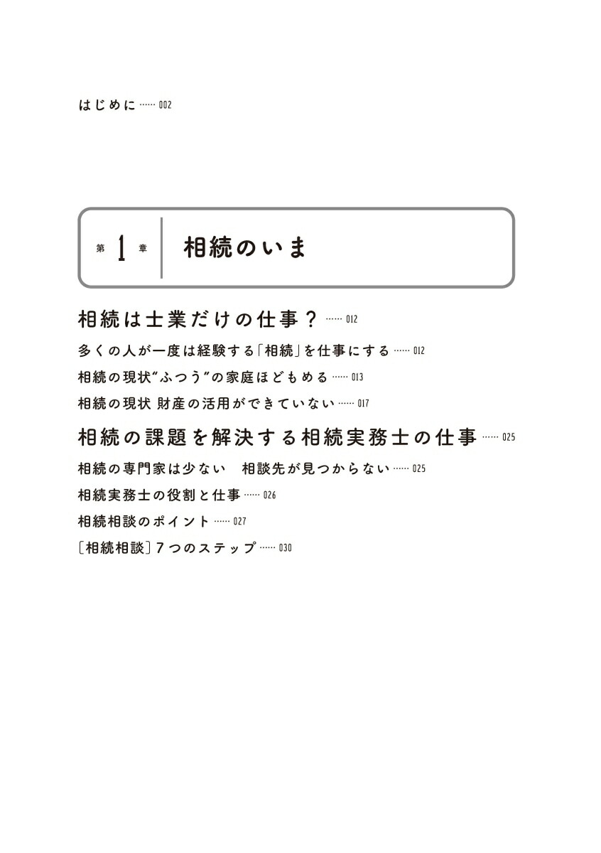第1章 相続のいま(相続は士業だけの仕事?/相続の課題を解決する相続実務士の仕事)/第2章 「相談」からはじめる相続実務士というお仕事(なぜ、相続実務士の仕事を作ったのか?/相続実務士は提案と解決する役割 ほか)/第3章 「相続」を仕事にするための7ステップ(相続実務士の基本コンセプト/相続相談7つのステップと時間配分(目安は60分) ほか)/第4章 さあ、はじめてみましょう!(相続実務士の仕事 相続相談ワーク/相続の課題解決&対策集)/第5章 相続実務の基礎知識(基礎に戻りながら実践をしていきましょう)