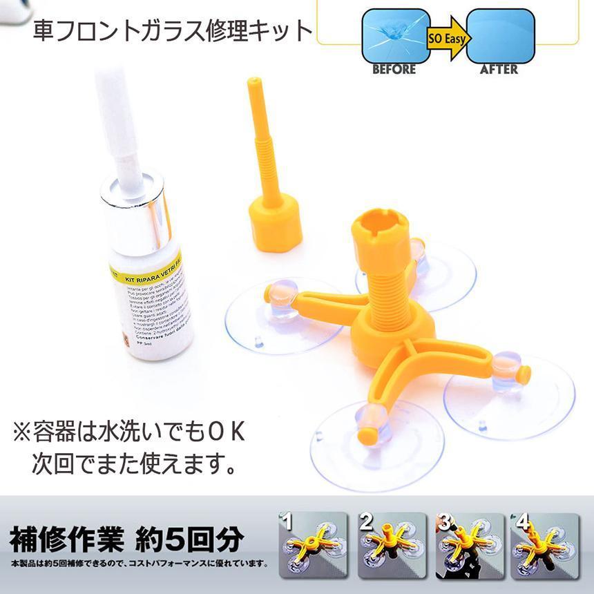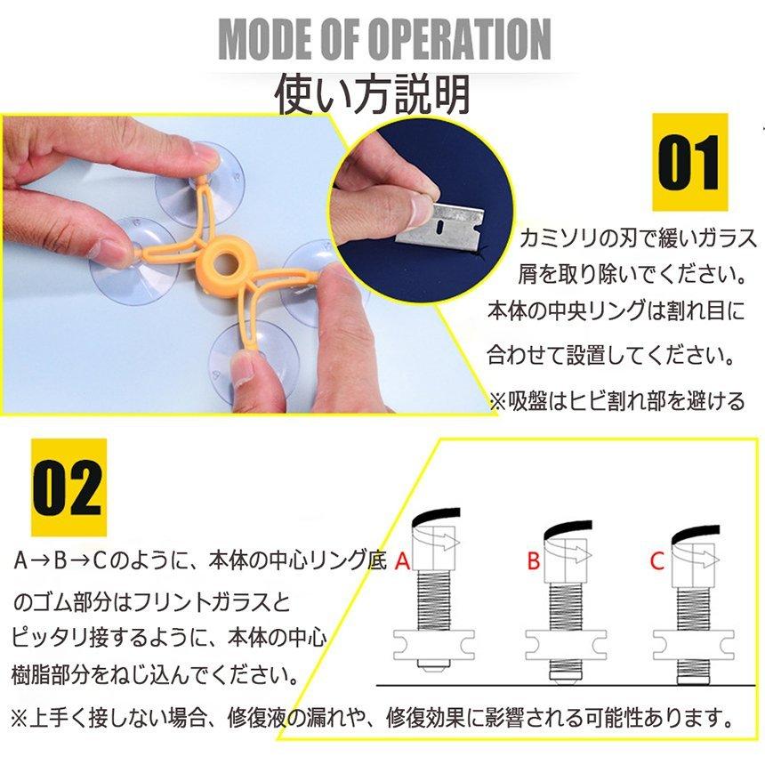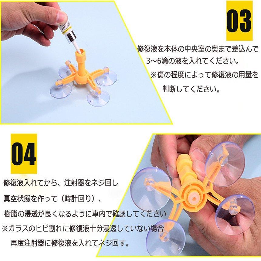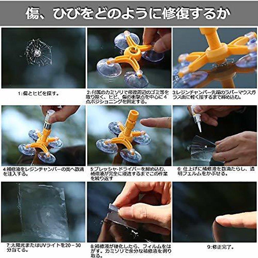 適用範囲:本製品は車のフロントガラスにのみ適しており、車の窓ガラスやその他のガラスには使用に適していません。補修できる傷の種類はブルズアイ、スタ一、ハーフムーン、長さは20センチ以下の傷、曲がれは20センチ以下の傷、ひび、放射状は20センチ以下の傷、ひび、または、直径が1インチ(25mm)の組み合わせ亀裂の修復 。包装内容:日本語仕様書x1、英語仕様書、レンジx1、スクレッパーx1、ボジショニングx1、レジンチャンバーx1、プレッシャ-ドライバーx1、透明フェルムx1。