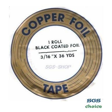 ステンドグラス 材料の定番品。裏糊が黒いブラックバックのコパーテープです。画像ではパッケージに薄くSGS-SHOPとありますが、当社撮影の画像を示すもので、お送りするものにはこのマークはありません。