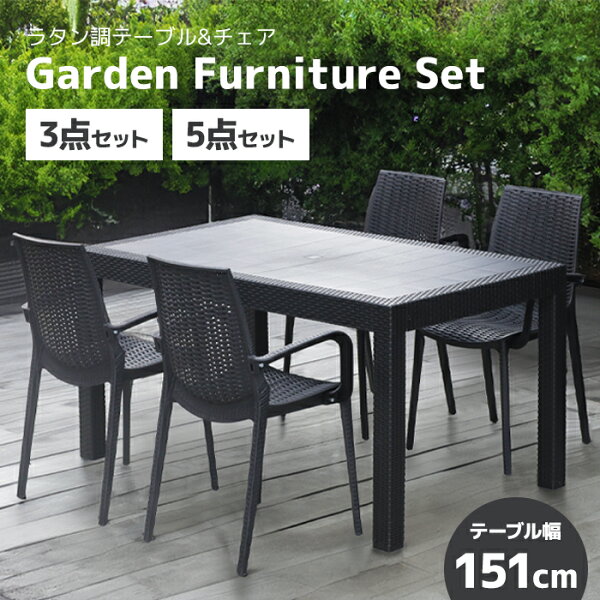 \6月8日全品5%OFF+39shop2倍+最大76%OFF!!/ラタン調 ガーデンテーブル 150cm チェアセット パラソル穴 アウトドア…