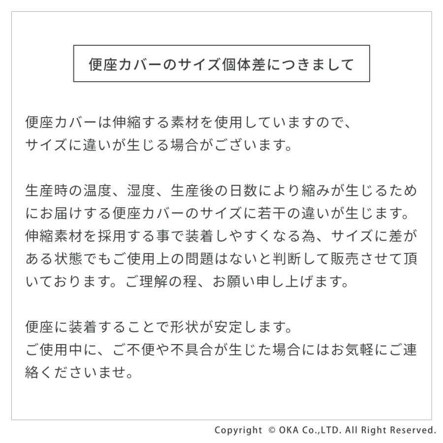 便座カバーは伸縮する素材を使用していますので、サイズに違いが生じる場合がございます。生産時の温度、湿度、生産後の日数により縮みが生じるためにお届けする便座カバーのサイズに若干の違いが生じます。伸縮素材を採用する事で装着しやすくなる為サイズに差がある状態でもご使用上の問題はないと判断して販売させて頂いております。ご理解の程、お願い申し上げます。便座に装着することで形状が安定します。ご使用中にご不便や不具合が生じた場合にはお気軽にご連絡くださいませ。
