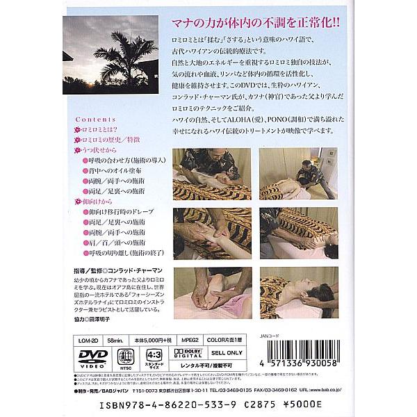 本場のハワイアンによるスピリチュアル・ヒーリング。ロミロミとは「揉む」「さする」という意味のハワイ語で、古代ハワイアンの伝統的療法です。自然と大地のエネルギーを重視するロミロミ独自の技法が、気の流れや血液、リンパなど体内の循環を活性化し、健康を維持させます。このDVDでは、生粋のハワイアン、コンラッド・チャーマン氏がカフナ(神官)であった父より学んだロミロミのテクニックをご紹介。ハワイの自然、そしてALOHA(愛)、PONO(調和)で満ち溢れた幸せになれるハワイ伝統のトリートメントが映像で学べます。