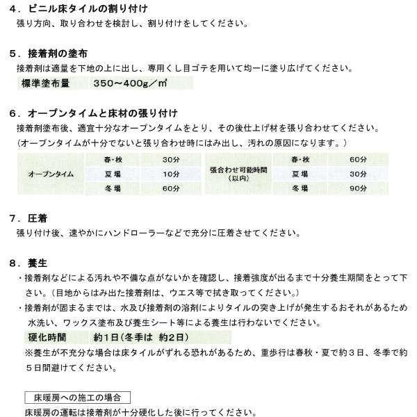 用途 川島織物のビニル床タイル全般特長 貼り替え時、簡単に剥がせて、残った接着剤も下地を傷めずに除去できる 耐湿性能がありトイレ、キッチンなどの水廻りにも最適。 低臭タイプで住宅施工におすすめ主成分:変成シリコーン樹脂適用下地 合板、モルタル、木質フローリング、クッションフロア標準手配量目安:350〜400g/平米施工可能面積:約7.5〜8.5平米/缶