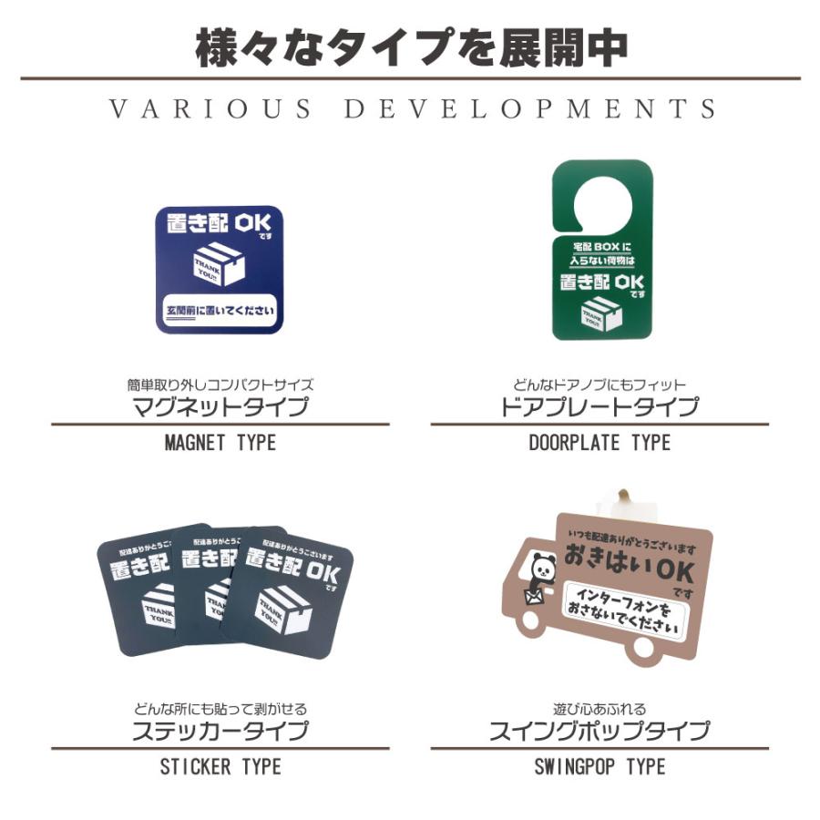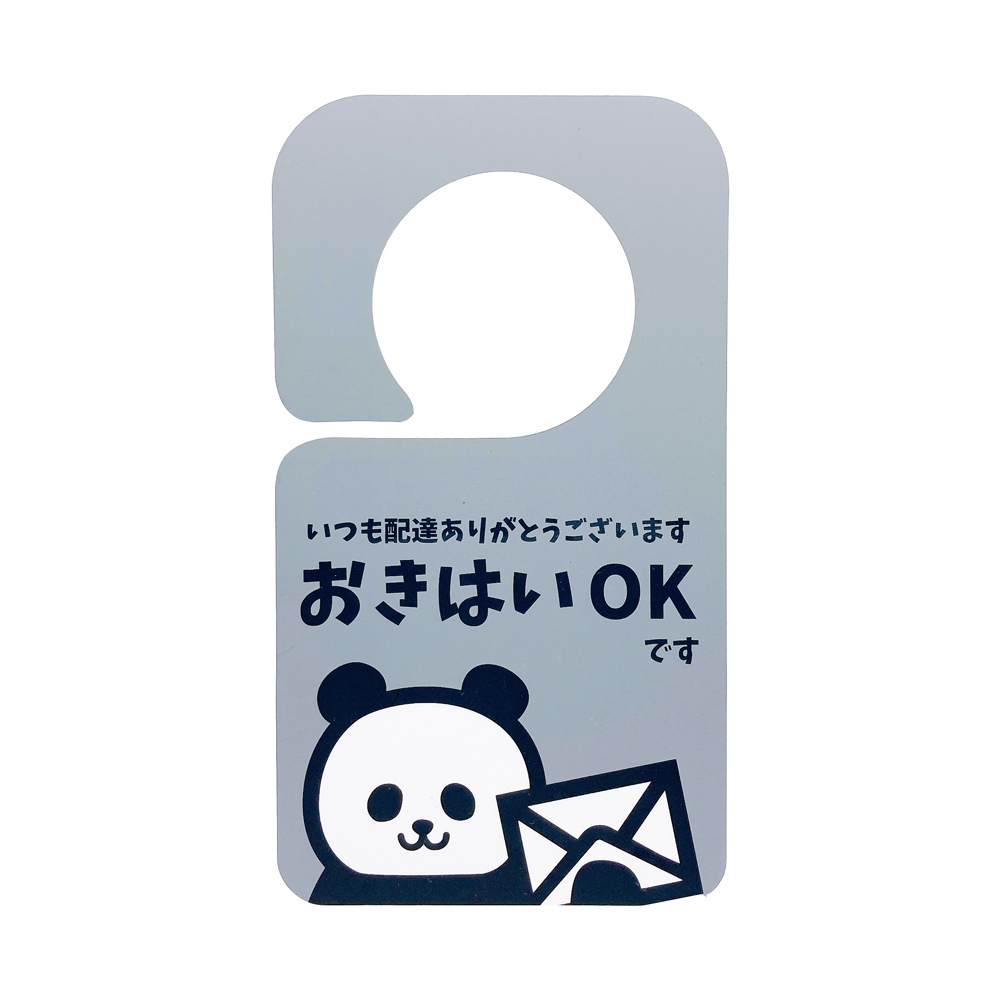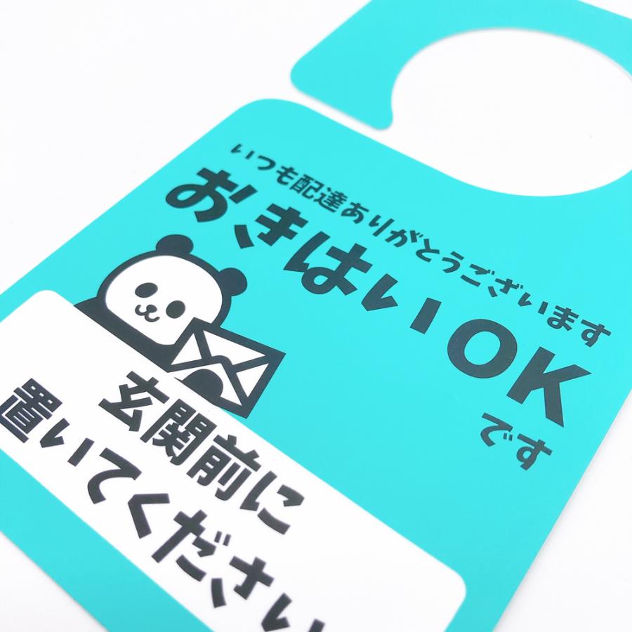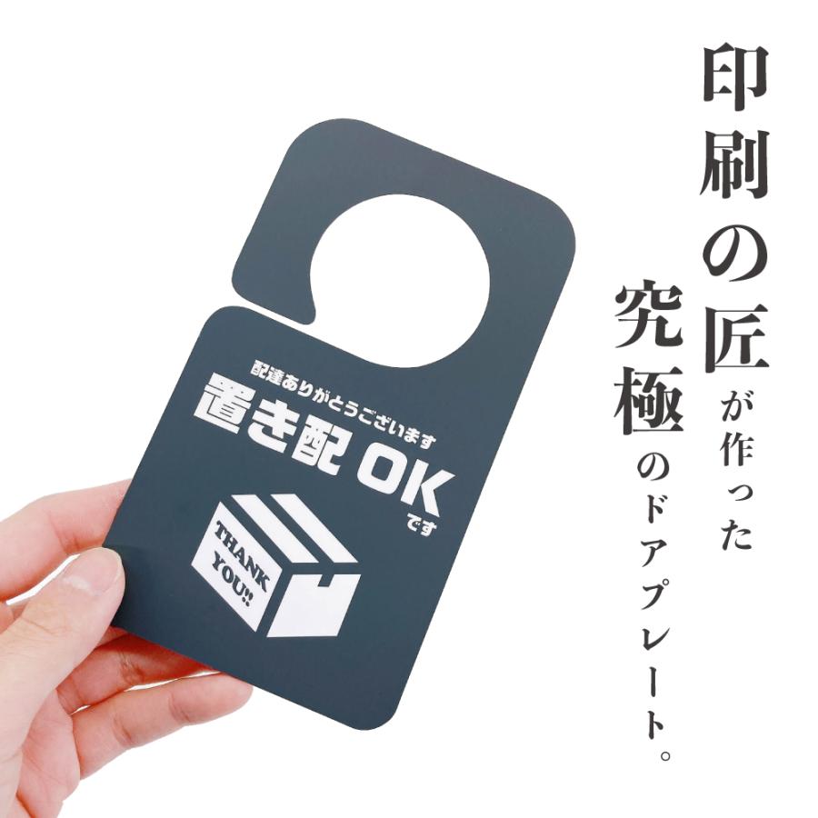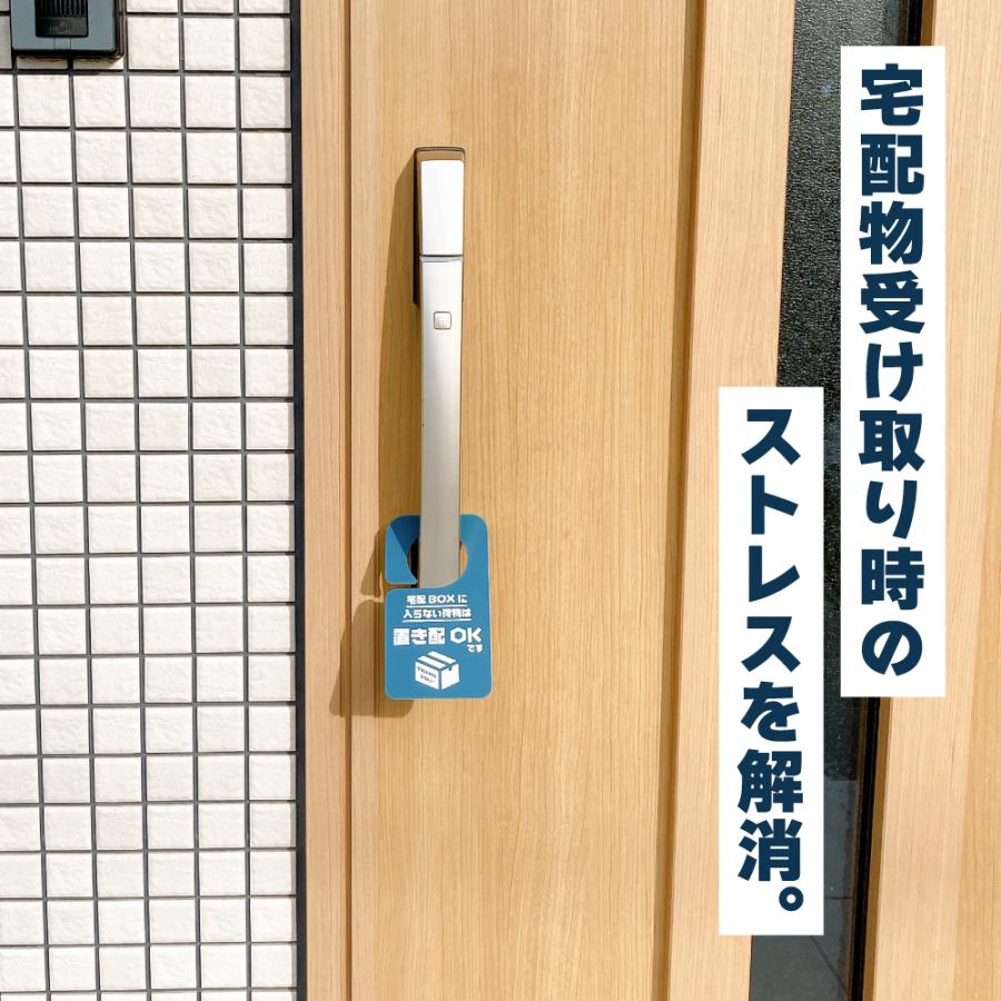 不在時の再配達を防止するドアプレートです。玄関ドアに引っ掛けるだけで『置き配OK』と伝えることができます。不在時はもちろん、在宅時でも 手が離せないから出られない、 ウイルス対策のため対面接触を避けたい、リモートワークでのWEB会議中に邪魔されたくない、子供のお昼寝中静かにしてほしい、スッピンで出られない、ウーバーイーツなどのフードデリバリーや宅配ボックスに入れてもらいたいときなど様々なシチュエーションで活躍します。また宅配業者の再配達問題も解決でき、盗難やトラブル防止にも役立ちます。 プレートは防水・撥水に優れるため、雨の日など天候の悪い日に掛けておいても問題ありません。日焼けによる色あせ・傷や汚れにも強く丈夫で長持ちします。軽量ですがしなやかで耐久性抜群。3年〜5年は安心してお使いいただけます。また丸みの直径を大きく設計したので、どんなドアノブにも合わせることができます。ステッカーやシールのように一度きりでなく何年も使用できるため、多くの方に反響の声を頂いている商品です。